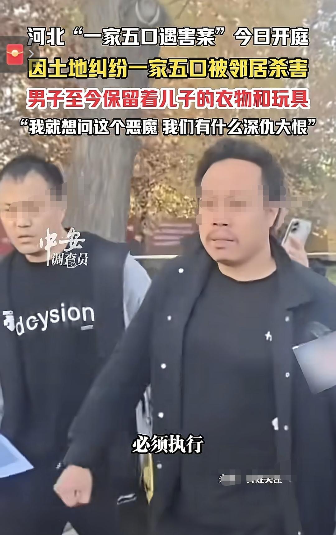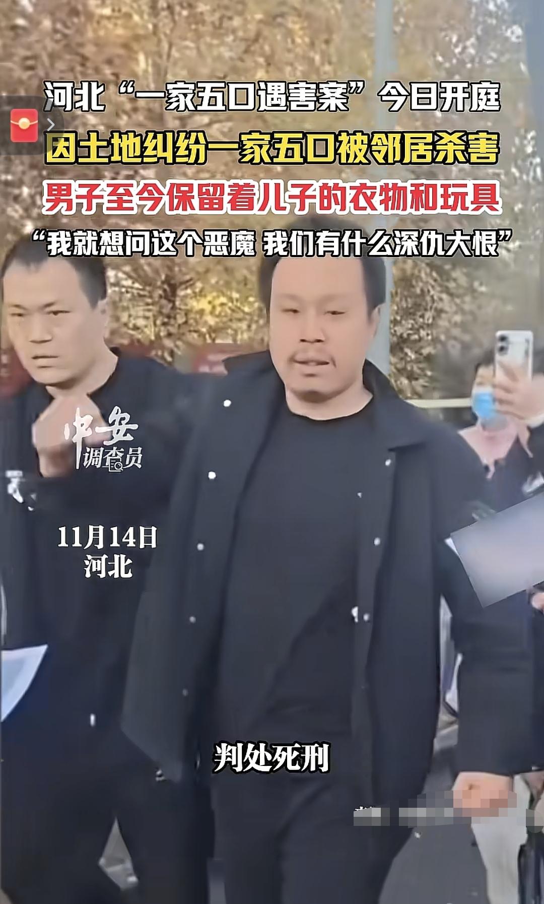 河北一家五口案,受害人家属李先生说“希望法庭能给去世家人一个交代” 一家五口就这么去走了,男子以泪洗面,家中还保留了孩子的衣服,玩具,这日子确实过得煎熬,身心疲惫 主要是他还有爷爷奶奶需要给他们养老,老婆娘家还有父母,他真的需要继续坚持下去! 就为了这么一点土地,还是公家的真的不知道该说什么好,在我们老家,如果自己建房用地,一般都是拿土地和别人去换,让人家选,大家都满意! 再者说,范某觉得李某占他的地,咱先不管占没占,最好的办法就是直接找村里解决,s人终究不可取,人活一辈子,不为自己着想,也要为子孙后代想啊,范某自己也是有儿子的人! 只是可怜了李某的小孩,才3岁呢!