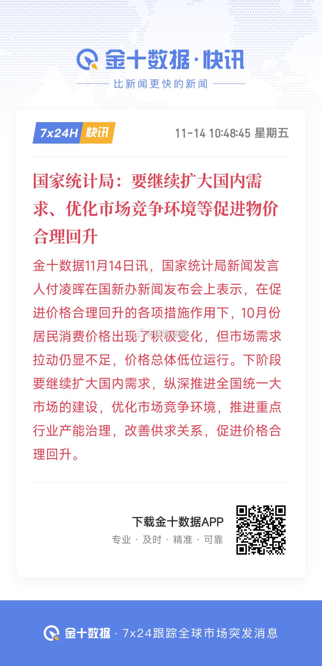 国家统计局:要继续扩大国内需求,促进物价合理回升。。