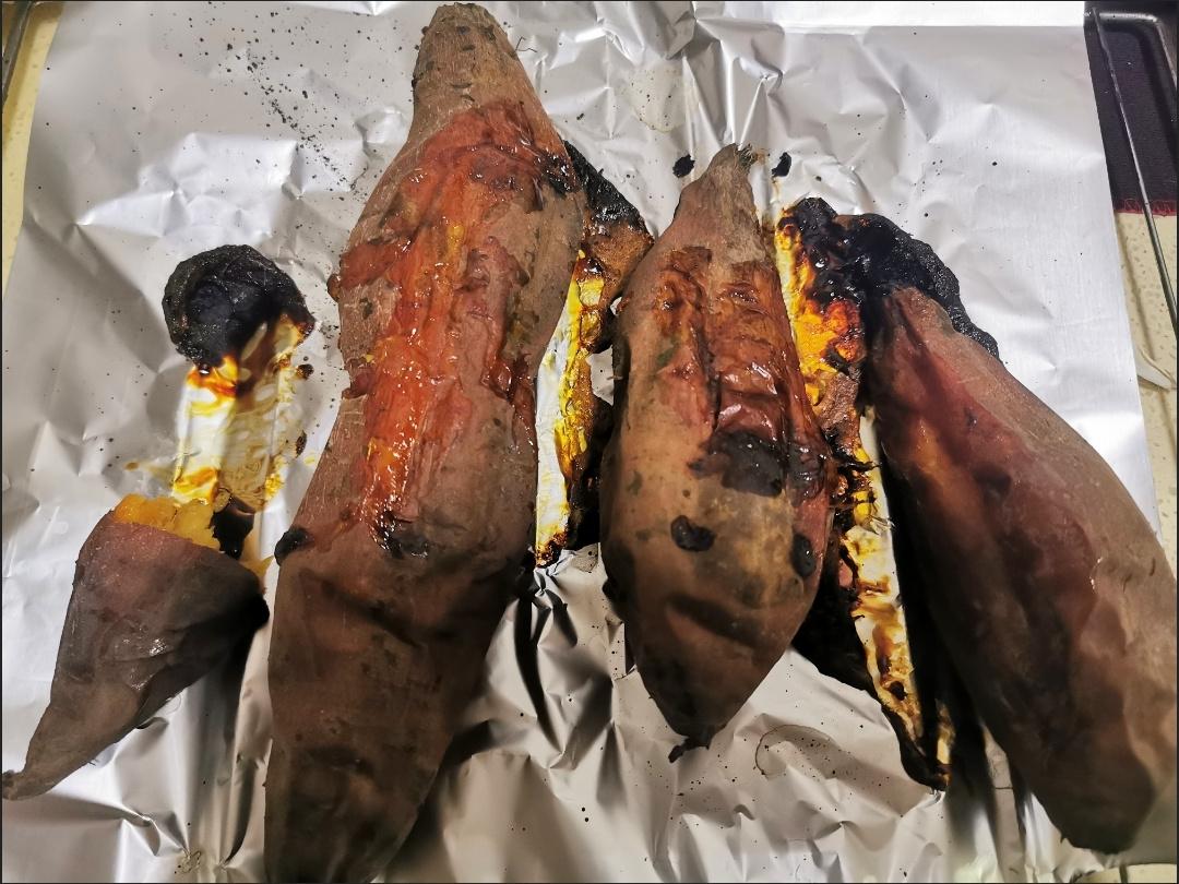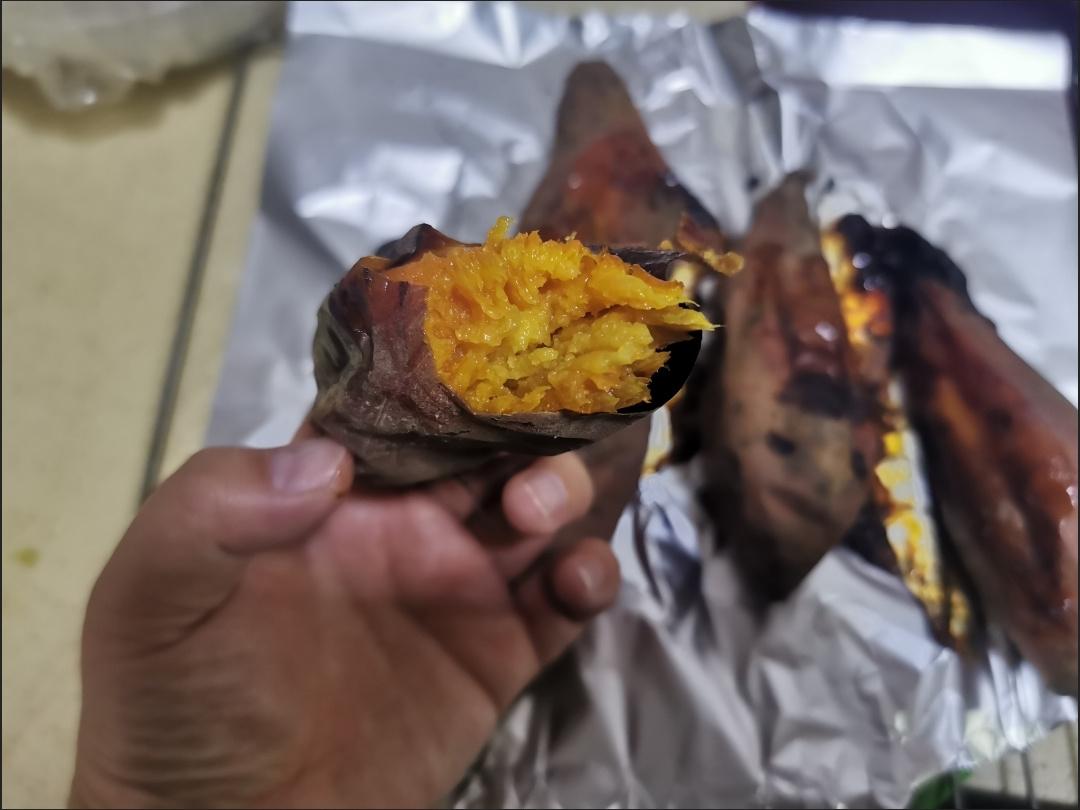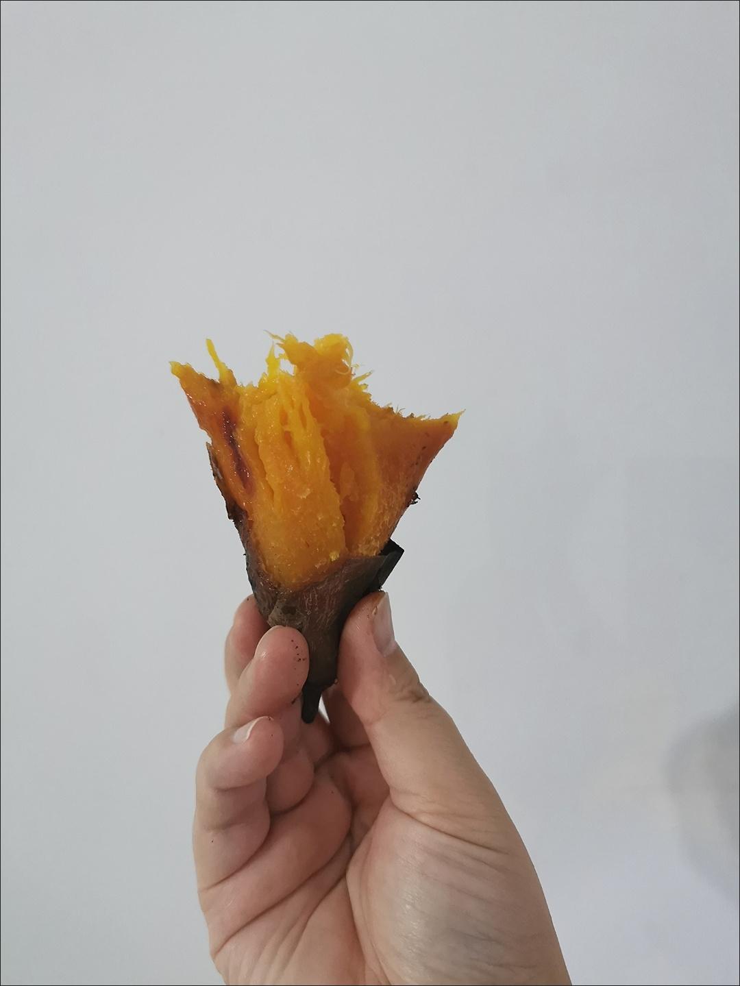 一切都是刚刚好,值得全心全意的当下,全心全意的感受,全心全意的生活,全心全意的吃。刚剥开皮那一瞬间,甜香直接扑脸!金黄的果肉软乎乎的,还带着点焦糖色的焦边,拿在手里都冒着热气,咬一口糯叽叽、甜滋滋的,一点筋都没有,从舌尖甜到心里头!果然红薯烤着吃才好吃,现在马路上遍地一个烤红薯要二十块。还是自己烤着好吃。