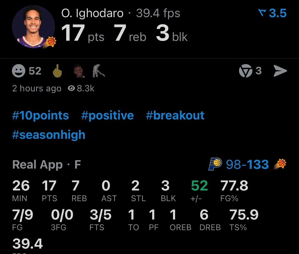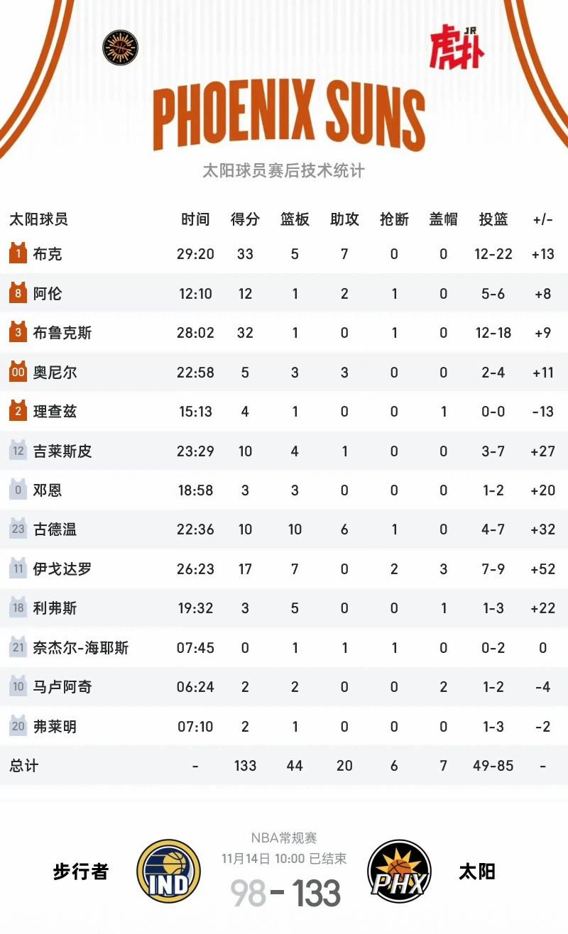 太阳一波五连胜将自己送到了西部第7的良好排名。 今天太阳133-98大胜双残阵步行者,注意看伊戈达罗的正负值高达+52,非常恐怖的数字。 曾经卢克·巴莫特在火箭有一场+57的,破了联盟记录了。