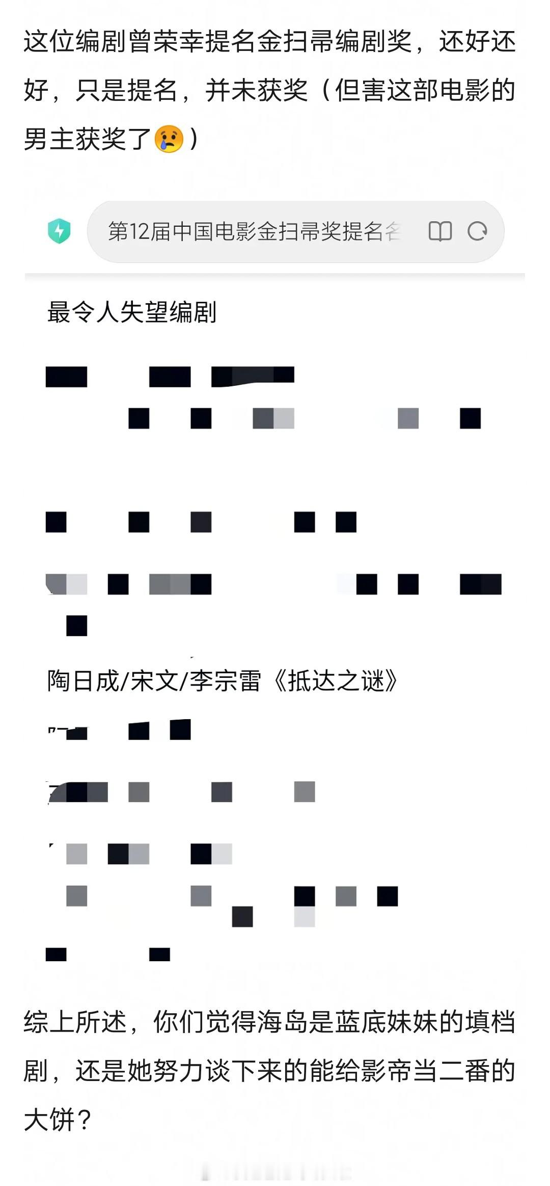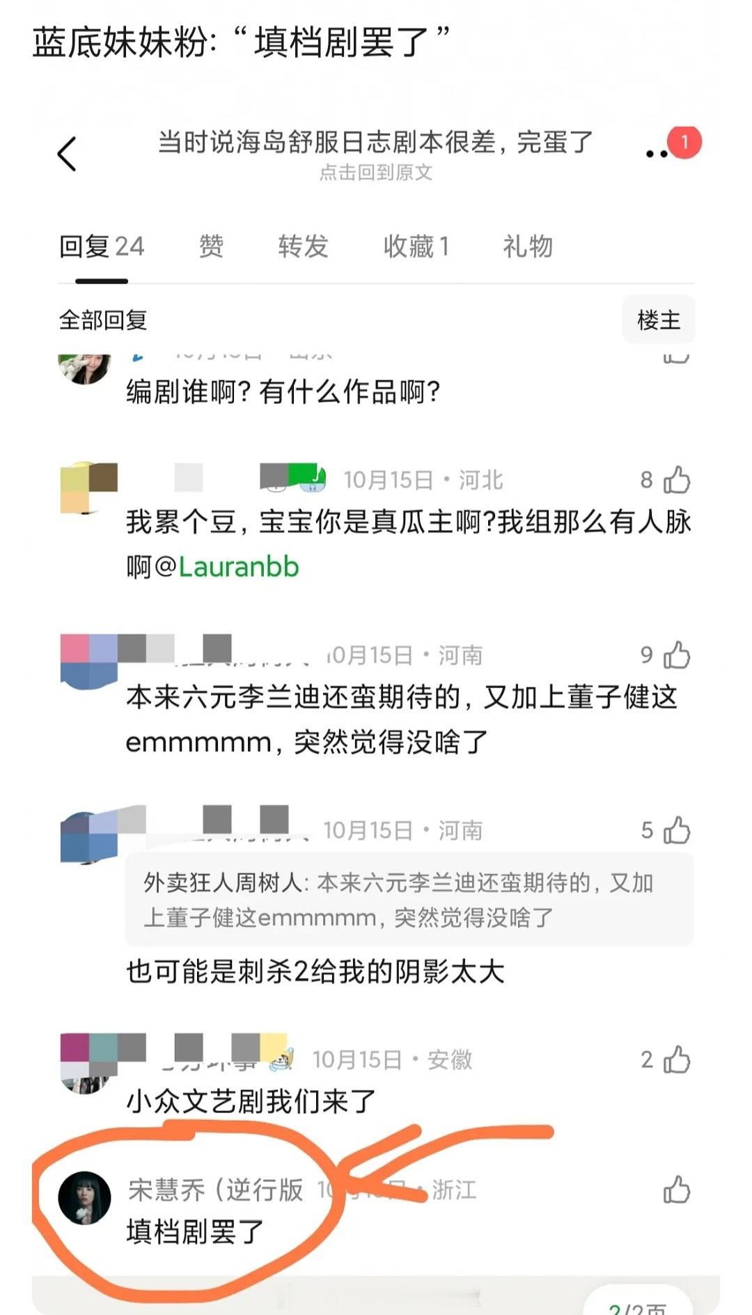 瓜主说李兰迪的《海岛舒服日志》是为了等月都花落,等男主和邓科档期,接的填档剧。海岛的第一编剧陶日成,豆瓣作品评分全都不及格,还提名过金扫帚编剧奖;剩下两位编剧都是新人,只负责过海岛。