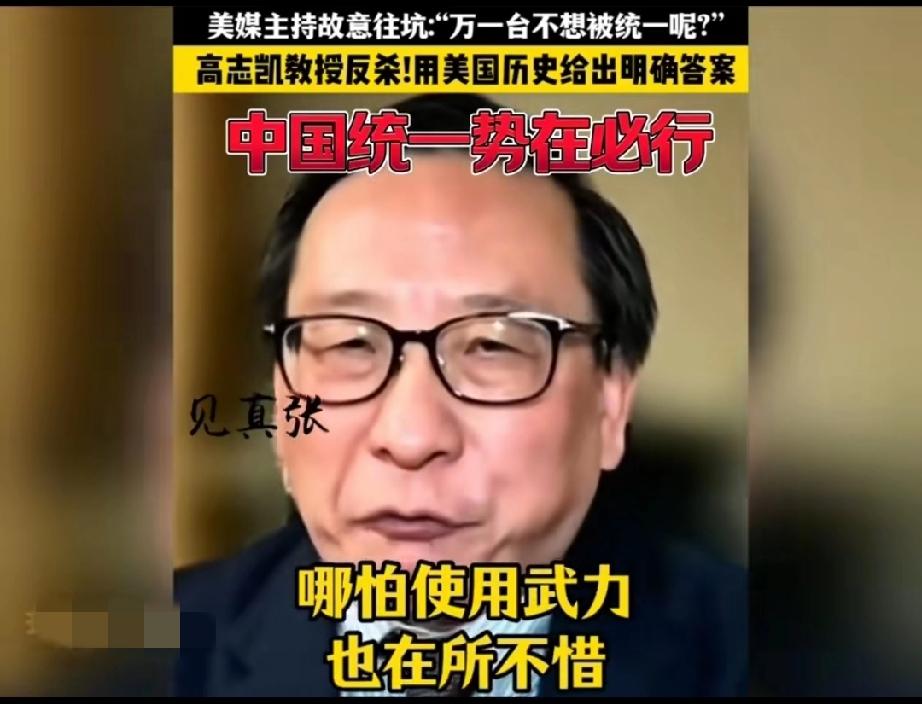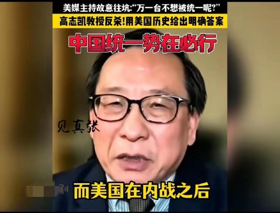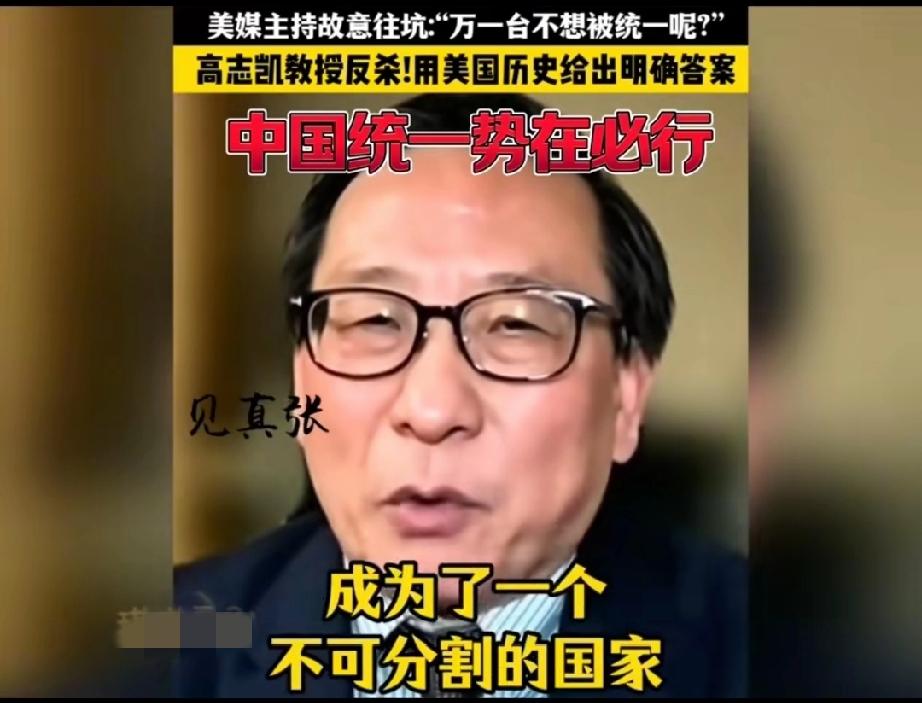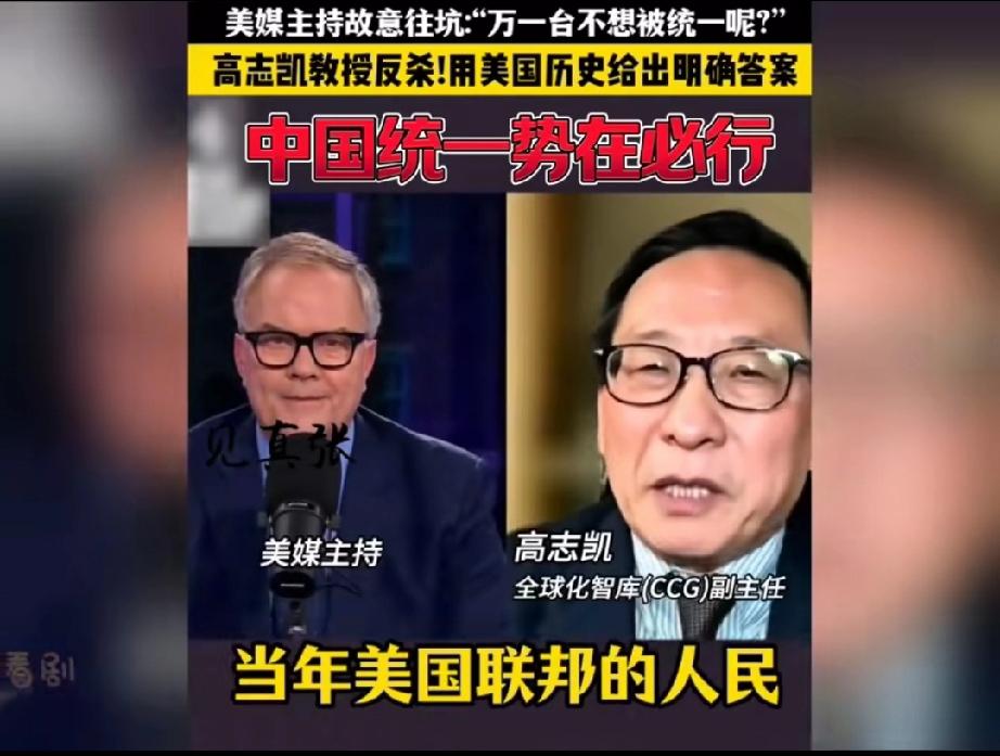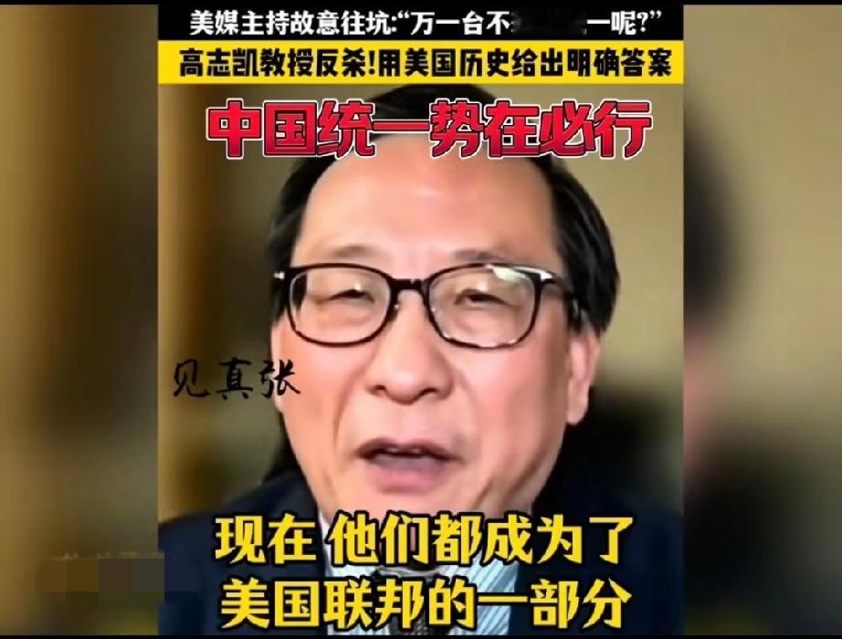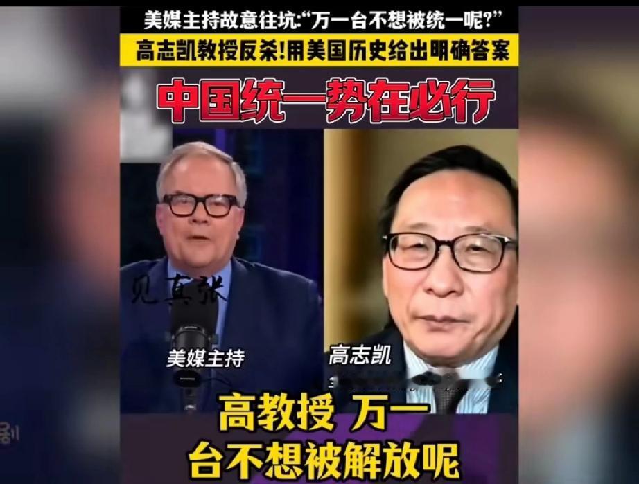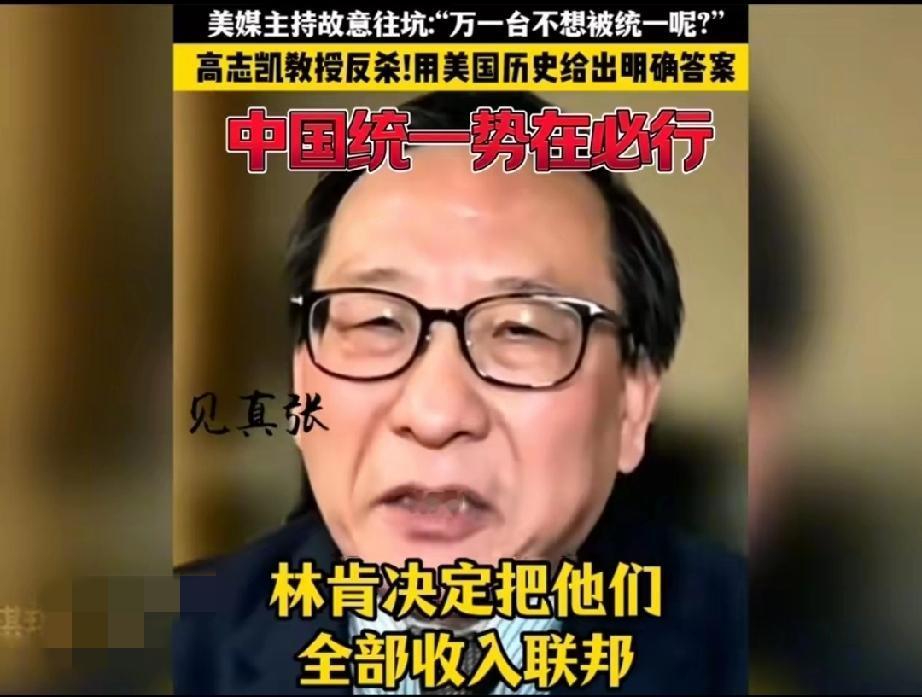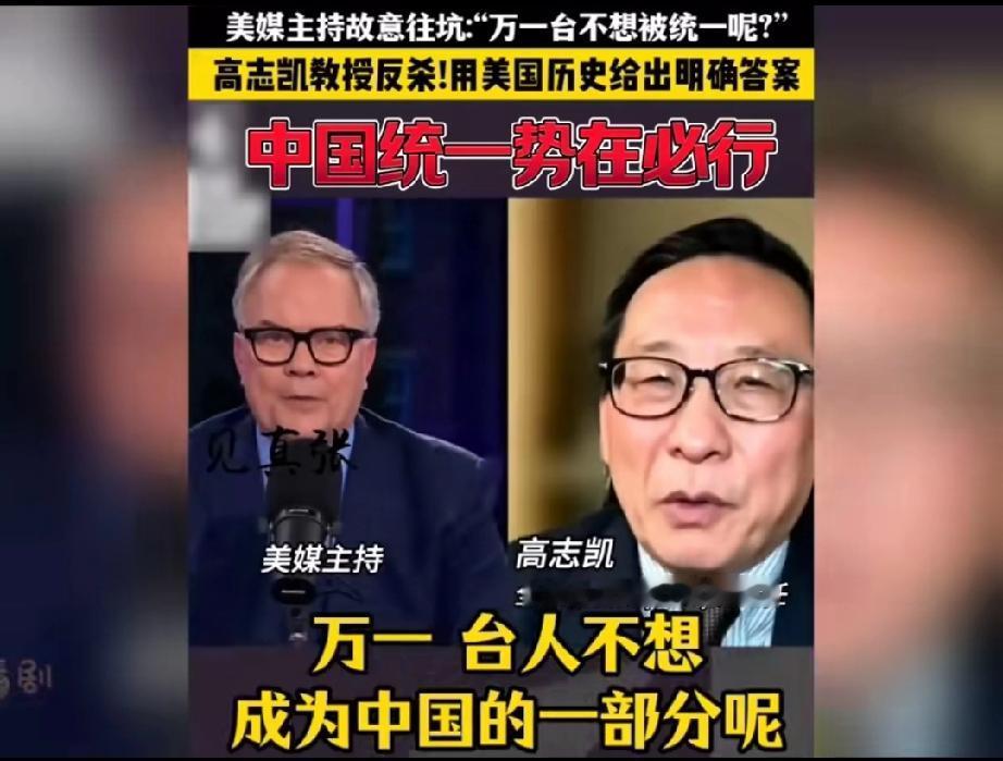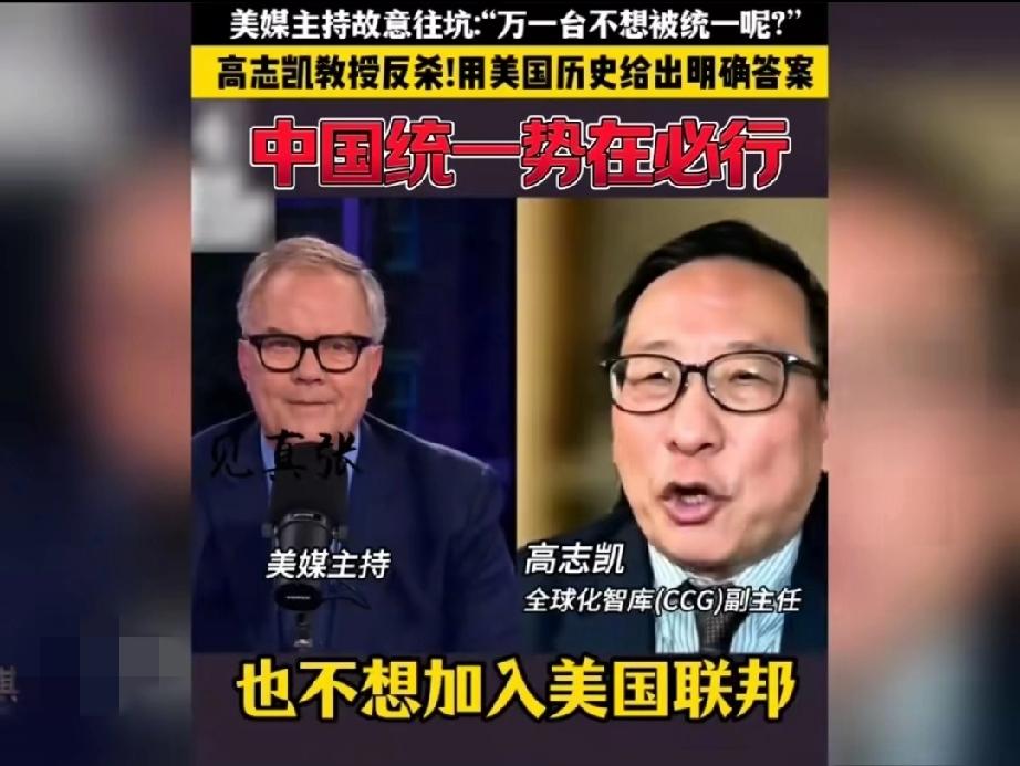 太惊险了,美国一档访谈栏目主持人企图用一个充满陷阱与刁难的问题让接受采访的高志凯翻车! 主持人不怀好意的问: “高教授,万一台湾不想被解放呢?万一台湾人不想成为中国的一部分呢?那你们打算怎么办?” 这个问题确实不好回答,要是直接回答用武力解决,人家会说你不热爱和平,不尊重台湾人的人权,只见高志凯灵光一现,不慌不忙的回答说: “当年你们美国要统一的时候,美国联邦的人民也有不想加入美国联邦的,你们的总统林肯还是决定把他们全部并入联邦,哪怕使用武力也在所不惜!现在他们也都成为了美国联邦的一部分,而美国就是就是在内战之后,才成为了一个不可分割的国家,所以说中国也会成为一个不可分割的国家!” 这话的水平实在是太高了,这叫以彼之矛攻彼之盾!得益于高志凯先生深厚的历史知识,再次说明一个道理,知己知彼才能百战百胜!