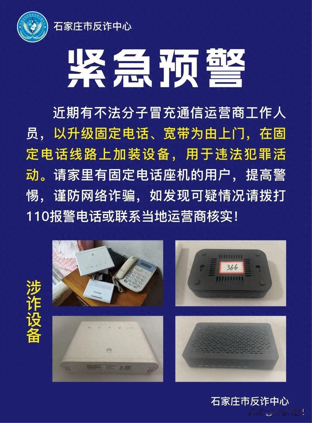 若有人上门安装这个设备,请立即报警![听歌] 最近在不少城市出现新型电话线诈骗,骗子盯上了家里的固定电话。 他们冒充宽带维修人员上门,偷偷在电话线上安装一种特殊设备,让境外诈骗电话显示成本地号码,不少家庭在不知情中成了骗子的“中转站”。 这种设备约手掌大小,通常为黑色,实际上是一种电话转接装置。它能将境外网络电话转换成普通固话信号,骗子在境外拨打电话时,受害人来电显示却是本地的固定号码。 这种伪装大大增加了诈骗的成功率,因为许多人看到本地固话号码会降低警惕。 这些诈骗团伙有明确的作案目标,特别偏好独居老人和出租房。 他们利用老年人对电信设备不熟悉、防范意识较弱的特点,以“免费升级”、“线路检修”等借口获得入户机会。 曾有一位老人家中被安装这种设备后,导致他人被骗走数百万元。 正规运营商的工作人员从不催促用户立即安装,也不会使用个人手机号联系客户。 他们通常有统一工装、佩戴工牌,且能通过官方客服核实身份。 真正的维修车辆也会有明显的企业标识,这些细节都可作为判断依据。 当工作人员上门时,最稳妥的方法是直接致电运营商官方客服。 提供维修人员的工牌信息,请客服帮助核实是否有此人工单。 同时,可以要求查看工作证原件,注意证件照片与本人是否一致,证件是否在有效期内。 安装后可以用家中座机拨打自己手机,查看来电显示是否为自家号码。 如果显示异常或无法接通,应立即联系运营商。 定期检查家里的弱电箱、电话接线盒,留意是否有不明设备接入。 目前,有的骗子会假装“反诈中心”人员上门,声称安装“防诈白盒子”,实则安装的仍是诈骗设备。 还有团伙以高薪兼职为诱饵,诱骗年轻人特别是学生群体协助安装,却隐瞒了设备的真实用途和法律责任。 根据相关法律规定,为诈骗团伙安装此类设备,即使只安装几台,也可能面临刑事责任。 已有案例中,涉案人员因协助安装多台设备被判处数年有期徒刑。 做子女的特别要提醒家中的长辈,遇到任何上门服务请求,先通过子女或邻居确认。 正规公司都会提前预约并发送短信通知,突然上门的“免费服务”往往藏有陷阱。 教会老人最简单的验证方法:拨打官方客服热线核实。 如果发现家中电话线被接入不明设备,正确的做法是立即断开设备电源并报警。 警方能通过设备序列号追踪来源,及时捣毁诈骗窝点。 切勿自行拆除或触碰设备,以免破坏破案线索。 此事件说明通信诈骗正以更隐蔽的方式侵入我们的生活,网络上尽是网友们担忧的话题。 “看完吓出一身冷汗!上周刚有自称移动公司的要给我奶奶升级网络,幸好邻居多问了几句,对方急匆匆就走了。” “我是通信行业的,这种VOIP设备其实很常见,但被骗子利用就可怕了。建议大家检查家里光猫,多出来的陌生设备直接拔掉。” “这些骗子太可恨了!我外公就接到过显示本地号码的诈骗电话,说医保卡异常,差点被骗走2万积蓄。” “提醒大家,现在装宽带都是师傅预约上门,穿带公司logo的工装,开有标识的车辆。突然上门的基本都是假的!” “作为物业人员,我们发现最近有陌生人在小区挨家敲门说检修线路。已加强巡逻,也请业主及时向我们核实上门人员身份。” “要注意那种说‘装白盒子防诈骗’的新套路!南京已经有大学生中招,以为是兼职,结果被警察找上门了。” “最简单的方法:直接打10000/10086/10010转人工,问有没有派单维修。我上周刚这样识破一个假师傅!” 你在生活中有没有遇到过类似情况?接到过显示本地号码的可疑电话,或者遇到过令人起疑的“上门服务”?欢迎在评论区分享你的经历,让更多人避坑! 信息源:防骗每日电讯