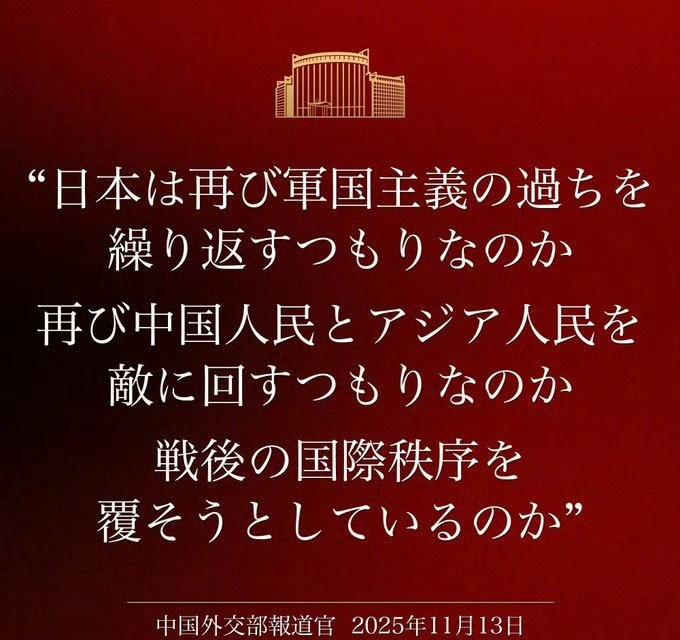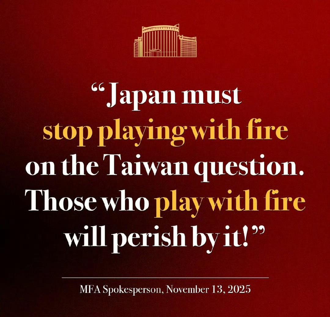 中国外交部发言人海外社交账号连发三组六张海报……其主要内容如下: 日本是否要重蹈军国主义覆辙? 是否要再次与中国人民和亚洲人民为敌? 是否企图颠覆战后国际秩序? 若日方胆敢武力介入台海局势,将构成侵略行为,中方必将迎头痛击! 日方不要在台湾问题上玩火,玩火者必自焚! 中国军号用日语发文 寰球探索君超话