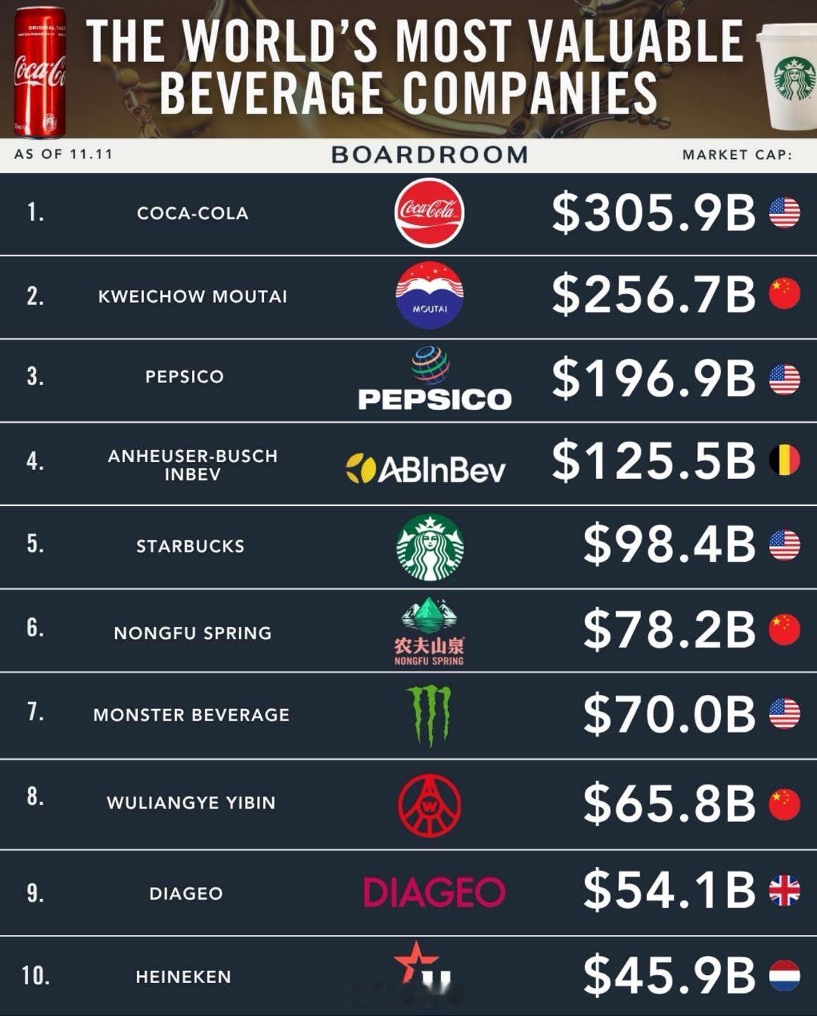【】全球市值最高的饮料公司 (截至2025年11月11日市值) The World’s Most Valuable Beverage Companies (Market Cap, as of 11.11)1.🇺🇸 Coca-Cola – $305.9B2.🇨🇳 Kweichow Moutai – $256.7B3.🇺🇸 PepsiCo – $196.9B4.🇧🇪 Anheuser-Busch InBev – $125.5B5.🇺🇸 Starbucks – $98.4B6.🇨🇳 Nongfu Spring – $78.2B7.🇺🇸 Monster Beverage – $70.0B8.🇨🇳 Wuliangye Yibin – $65.8B9.🇬🇧 Diageo – $54.1B10.🇳🇱 Heineken – $45.9B资料来源:董事会