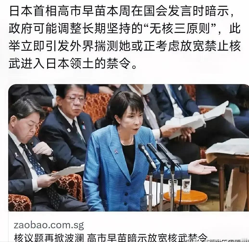 看看外国网友的发帖,就知道日本的挑衅有多强,高市早苗有多危险?最新消息,高市早苗在发表涉台错误言论后,又狂妄叫嚣:无法保证日本不制造核武。 高市早苗是否要制造“核武”?这是想再次突破底线,硬闯红线,这不是在玩火吗?但谁也逃脱不了这个规律,玩火者必自焚! 要理解这句话的分量,得先明白它触碰了日本社会哪根最敏感的神经。二战后,日本走和平发展道路,其宪法第九条明确放弃战争,并且国家长期奉行“无核三原则”,即“不拥有、不制造、不运进核武器”。 这不仅是法律和政策,更是经历过原子弹爆炸的日本民众内心深处的一道铁律,一种刻骨铭心的集体记忆。高市早苗作为曾经的自民党政调会长、总裁选举的有力竞争者,绝非无名之辈。 她这样的人物,用“无法保证”这种暧昧又充满挑衅的措辞来谈论核武,背后的意图就值得玩味了。这已经不是简单的政策探讨,更像是在试探国内外的底线,看看这条红线到底还能不能碰。 而这番核武言论,也和她之前在涉台问题上的表现一脉相承。不久前,她就曾大放厥词,声称“台湾的安全就是日本的安全”,甚至扬言要“协防台湾”。 这种言论,直接粗暴地干涉了中国内政,完全无视了中日之间已有的政治承诺。当时就引起了轩然大波,很多人以为这只是为了选举而放出的狠话,博取眼球。 可现在看来,事情远没有那么简单。从台湾问题到核武问题,她似乎在构建一个完整的、极具攻击性的政治议程。这种步步紧逼、层层加码的做法,让周边国家不得不警惕,这究竟是她个人的政治秀,还是日本右翼势力整体冒进的一个缩影? 有趣的是,当你把视线从中文互联网移开,去看看其他国家网友的反应,会发现一个更复杂的图景。在一些西方国家的论坛上,确实有人将高市早苗的言论解读为面对“地区威胁”时的“正常反应”,认为日本有权“自卫”。 但这种声音很快就被更多的担忧和批评所淹没。许多国际关系学者指出,一个突破“无核三原则”的日本,将彻底颠覆东北亚乃至全球的战略平衡,引发一场难以预测的军备竞赛。 韩国等曾遭受日本侵略的国家的网友,反应则更为激烈,他们用“军国主义复活”、“历史的背叛”等词语来表达愤怒和恐惧。在他们看来,一个不愿深刻反省历史、反而试图拥武自重的日本,是地区和平最大的威胁。 就连日本国内,对高市早苗的激进言论也并非一片叫好。不少主流媒体和普通民众表达了深深的忧虑。他们担心,这种言论会彻底摧毁日本多年来苦心经营的国际形象,让日本重新被孤立。 毕竟,对于核武器,日本民众有着最直接的恐惧。政客为了选票和权力,拿这种沉重的话题当儿戏,无疑是在玩火。 高市早苗的政治导师是安倍晋三,而安倍在任时,就一直在试图修宪,推动日本成为一个“正常国家”。如今,高市早苗似乎正沿着这条道路走得更远、更激进。她所代表的,是一种渴望挣脱历史束缚、追求军事和政治大国的野心。 这种野心,就像一匹脱缰的野马,正朝着悬崖狂奔。历史一再警示我们,任何试图挑战战后国际秩序、无视他国安全关切的行为,最终都会反噬自身。 高市早苗的言论,就像是在火药桶旁边点燃了一支火柴,即便她认为自己能控制火势,但谁能保证不会引发剧烈的爆炸? 这盘棋已经越下越险,每一步都可能满盘皆输。对于高市早苗的这系列言论,以及其背后所代表的日本政治动向,你又是怎么看的呢?这究竟是一场危险的政治豪赌,还是一次必然会自食其果的挑衅?欢迎留下你的看法。