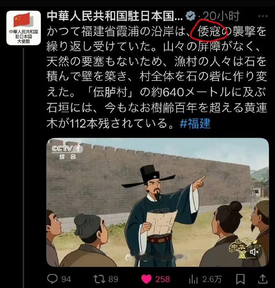 中国驻日大使馆威武,又发布一篇跟日本有关的帖子,直接称呼“倭寇”。哈哈哈,太给力