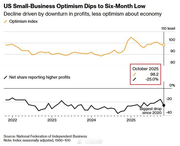 【】美国小企业对经济形势感到担忧: 10月份,NFIB小企业乐观指数下跌0.6点,至 98.2,为6个月以来的最低水平。 与此同时, 过去3.个月报告收入增加的小企业主净份额下降了-9百分点,至 -25%,为 5 月以来的最低水平。 这是自 2020 年疫情爆发以来最大的月度跌幅。 销量下滑和原材料成本飙升是导致跌幅的主要原因。 与此同时, 对未来6个月经济改善的预期下降了3个百分点,至20%,为4月份以来的最低 水平。小企业主们感到担忧。