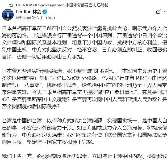 中国外交部罕见用中文、英文、日文发布强硬表态。印象中,中国外交已经很久没有做过这样斩钉截铁的表态。 这应该也是第一次公开表示“坚决行使《联合国宪章》和国际法赋予的自卫权”。 日本国内的舆论,已经在公开批评高市早苗的发言太鲁莽。 日本若继续执迷不悟,无视中国的警告,必将自食恶果。 这记重拳的起因,要追溯到日本一位政客的惊人言论。日本自民党政调会长高市早苗,在一个电视节目里公开谈论,日本是否应该讨论“核共享”政策,也就是像北约某些国家那样,在本国部署美国的核武器。 这话一出口,就像在平静的油锅里泼了一瓢冷水,瞬间炸开了锅。要知道,作为世界上唯一遭受过核武器攻击的国家,日本国内对核武器的话题有着极为敏感和复杂的情绪,“无核三原则”更是长期被视为日本国策的基石。 一位在任的高官,尤其是在负责政策制定的关键位置上的政客,公然触碰这条红线,其带来的冲击波可想而知。这已经不是简单的口误或者个人观点,而可能是在试探某种底线,释放某种危险的信号。 中国方面的反应之所以如此剧烈,正是因为看透了这背后潜藏的巨大风险。高市早苗的言论,不仅仅是一个关于国防政策的讨论,它直接挑战了战后东亚地区的安全秩序。 当一个曾给邻国带来深重灾难,且自身有过核爆惨痛历史的国家,其高级官员开始严肃讨论拥核或共享核武时,任何一个邻国都无法保持镇定。 这不再是钓鱼岛海域的船只对峙,也不是历史教科书的文字之争,这是关乎国家生存安全的根本性问题。 因此,中国援引“自卫权”,实际上是在发出一个最严厉的警告:任何试图将核威胁引入中国周边的行为,都将被视为对中国国家安全的直接挑衅,中国保留采取一切必要措施进行反击的权利,这种权利是国际法所赋予的,不容置疑。 有趣的是,这记重拳打出去,日本国内首先乱了起来。高市早苗的言论非但没有为她赢得多少支持,反而引来了铺天盖地的批评。 日本主流媒体纷纷发文,指责她的发言“极其鲁莽”、“不负责任”,完全脱离了日本现有的国家安全保障框架。就连自民党内部,也有不少声音与她划清界限,认为这会给日本外交带来灾难性的后果。 这种内部的压力,恰恰说明,理性的声音在日本社会依然存在。他们清楚地知道,一旦走上“核共享”这条不归路,日本将彻底沦为大国博弈的棋子,失去战略自主性,并把整个国家置于风口浪尖。 高市早苗的“冒进”,反而像一面镜子,照出了日本社会内部对于和平与战争、依附与自主的深刻分歧。 整个事件的走向,现在变得扑朔迷离。它像一颗被投入池塘的石子,激起的涟漪正在不断扩大。这究竟是一个极端政客的个人哗众取宠,还是日本政坛某种思潮开始浮出水面的冰山一角? 美国在其中又扮演了什么样的角色?是默许,还是暗中鼓励?这些问题都没有简单的答案。 但可以肯定的是,地区国家之间的信任正在被快速侵蚀,彼此的猜疑链在不断加固。当一个大国开始明确地将“自卫权”与另一个大国的“内部言论”挂钩时,这本身就预示着危险的临近。 如果日方不能正视这种警告,继续在危险边缘试探,那么未来的局势发展,恐怕就不是任何一方能够轻松掌控的了。 这场地缘政治的博弈,正变得越来越像一场高压下的豪赌,每一个参与者都需要想清楚,自己能否承受赌桌崩塌的后果。对于这起事件以及它可能带来的深远影响,你又是怎么看的呢?