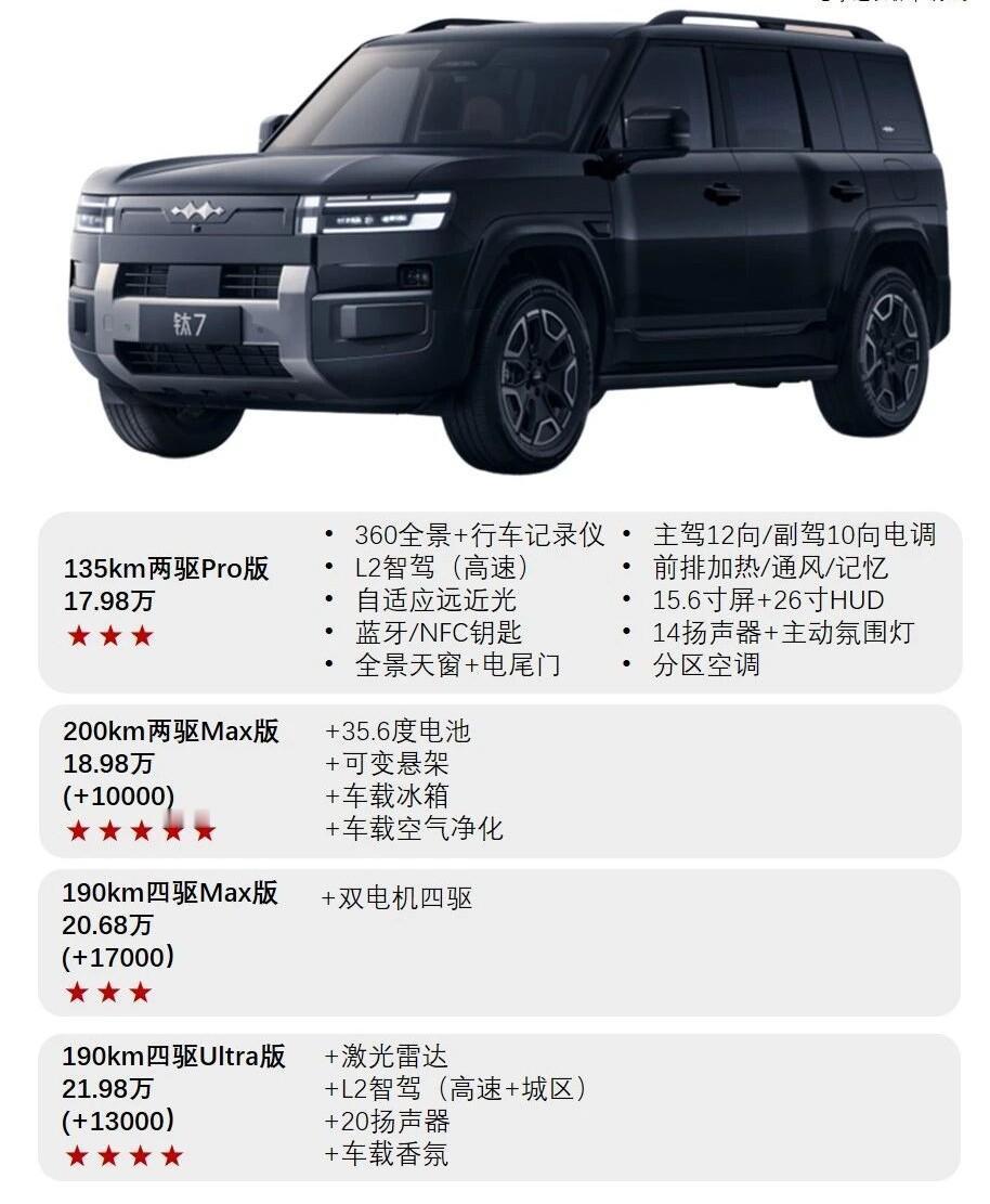 不到18万的比亚迪“方盒子”!买啥配置好?最近的方程豹结结实实火了一把 因为他们刚上市的一款钛7火了—— 不到18万的插混“方盒子” 22万就有带激光雷达的城区智驾 威武的外观、强悍的性价比吸引了很多人捧场 但他实际的性价比又怎么样呢? 买哪个配置才最好呢? 小迪赶紧带大家看看~ 基本参数 发动机:1.5T(156马力) 馈电油耗:5.9L/100km(WLTC)(前驱)、6.4L/100km(WLTC)(四驱) 电动机:272马力(前驱)/490马力(四驱) 电池:26.5/35.6(kWh) 纯电续航:135km/200km/190km(CLTC) 底盘:前双叉臂/后五连杆 配置推荐 入门配置已经足够丰富 实际上目前最受欢迎的是顶配的s四驱Ultra版 22万就能买到四驱+主动悬架+城区智驾+大电池 而迪子的电驱技术的含金量大家都知道的 但是从日常用车的角度出发 如果不是在北方,对四驱有刚需 或者对城区智驾有刚需的话 有大电池+冰箱+主动悬架 20万左右就能落地的次低配才是最划算的 日常家用完全够了~ 你觉得钛7这个价格怎么样 你觉得哪个配置更划算? 欢迎积极留言哦~
