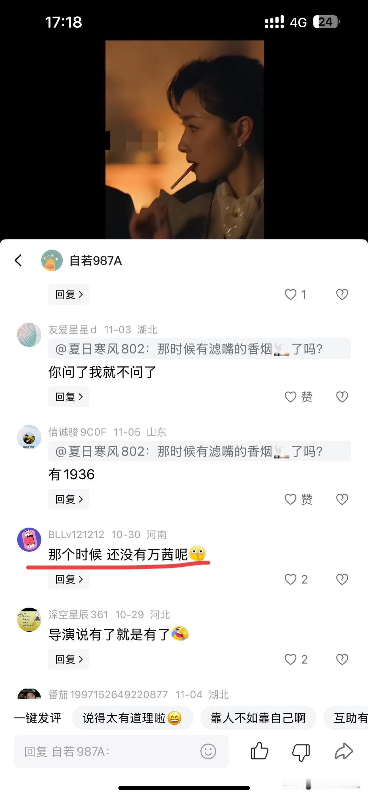 又美又飒的万茜,你让我好出戏 电视剧《朱雀堂》,万茜变身黑帮老大,气场全开,又美又飒。 唯一让观众出戏的就她的吸烟。 广电部早已出台禁烟令,在影视剧中不得出现吸烟的镜头。记得有一部刑侦剧《我是刑警》中,把演员手中的香烟P掉,造成角色空手在嘴前比划,极其搞笑。 《朱雀堂》却是完全无视禁烟令,万茜在剧中各种掏烟、叼烟、点火、吐烟的耍帅,不得不说,着实的帅酷痞。 那为啥说她的吸烟让观众出戏呢,问题就出在这个烟上。 这是民国诶,啥前儿出的过滤嘴啊,还是细支的,烟纸也是现在才有的特种工业用纸,民国时期别说中国,美国也生产不出来这种高级卷烟纸。 于是有人质疑,,那个时代有细支过滤嘴香烟吗?跟着有杠头回怼:那个时代还没有万茜呢! 我竟无言以对! ————————