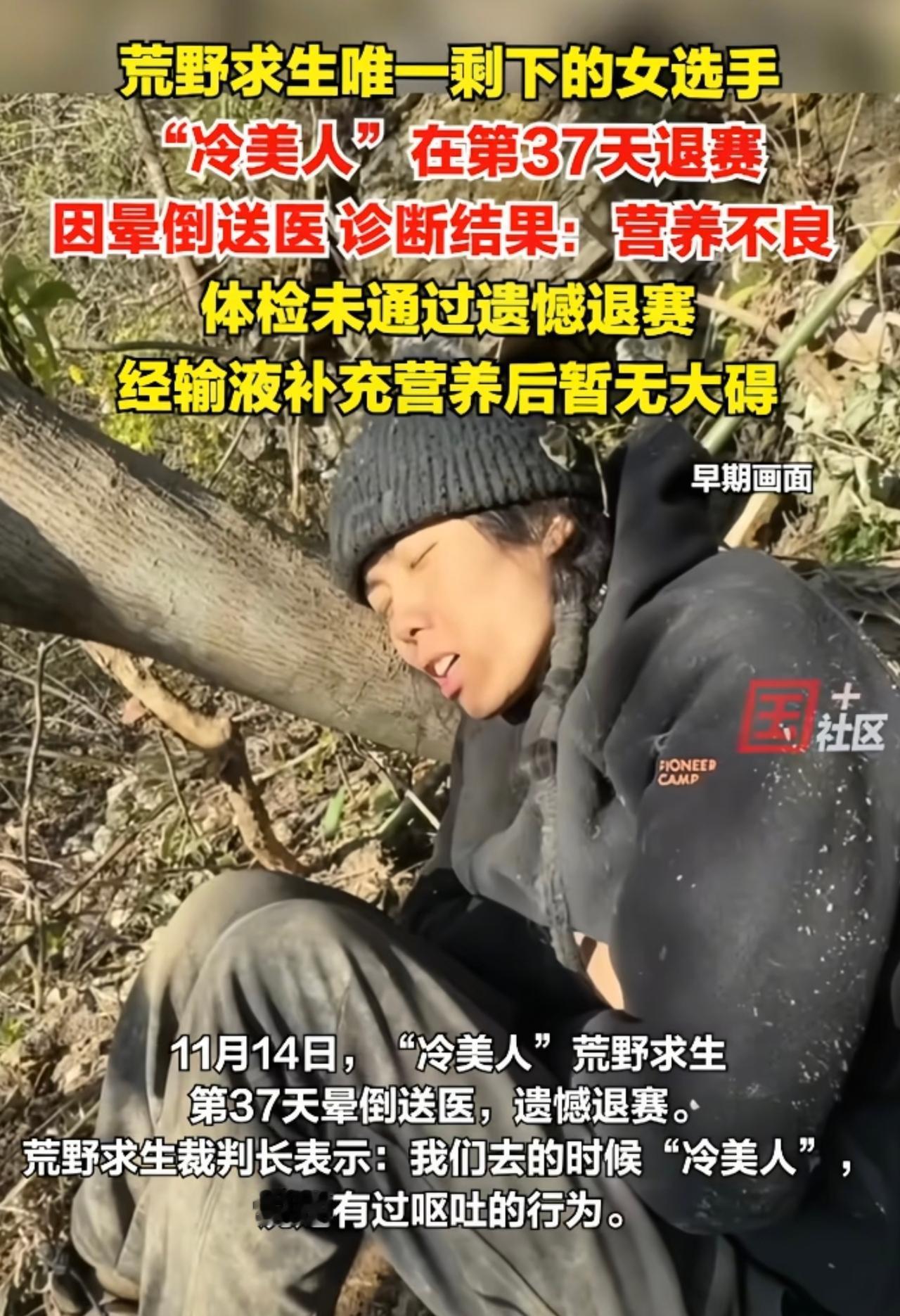 “冷美人”晕倒遗憾退赛了,好在只是营养不良,其实她已经比大部分人都强,敢吃“蛋白质”,敢一个女生夜间过夜,敢一个人在浑身淋湿后依然苦熬,敢在生理期身体不适依然不放弃,敢抛下所谓的“面子”蓬头垢面。不论是挑战自己,还是为了比赛奖金,还是获得流量,她已然做的很好,这种荒野求生又有几人能够做到。