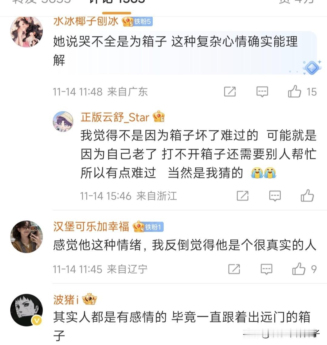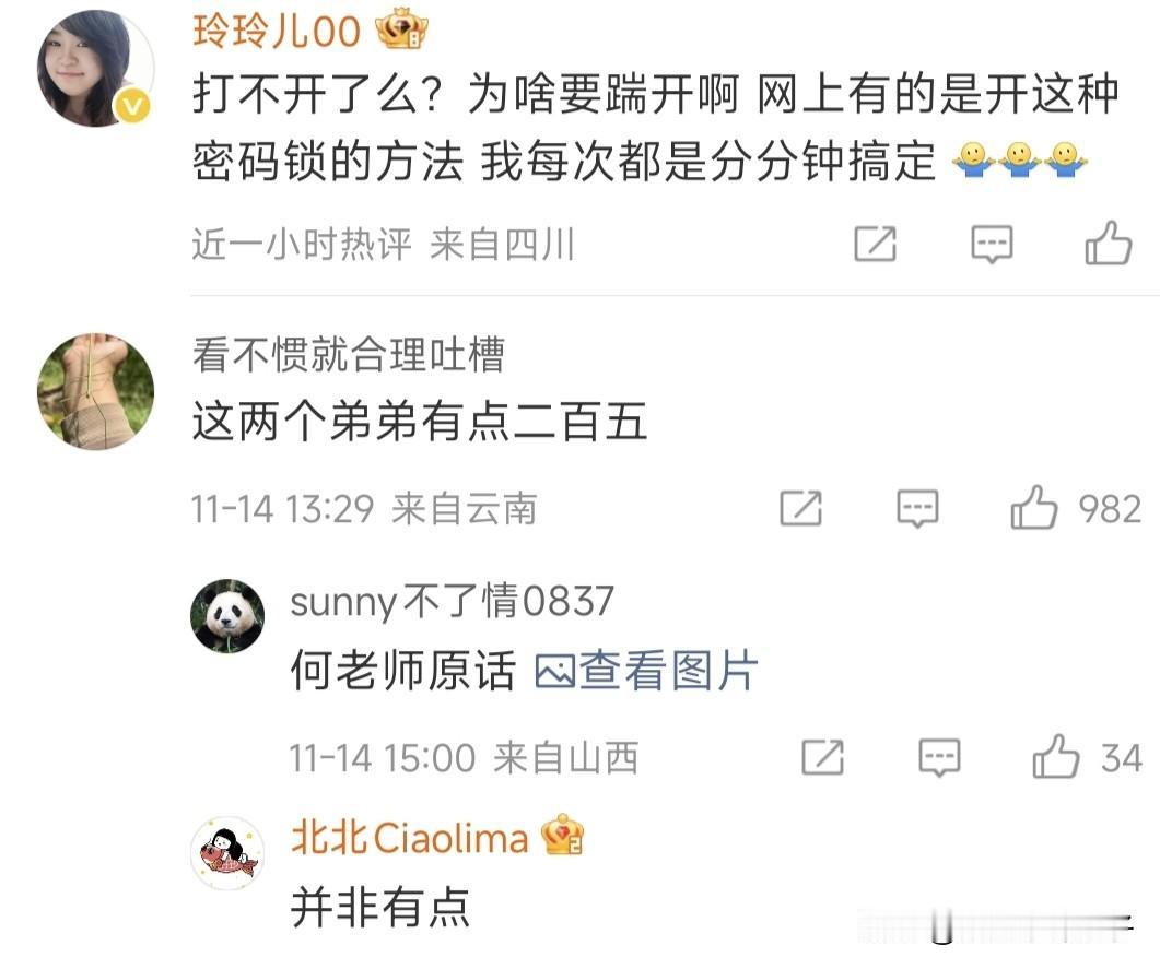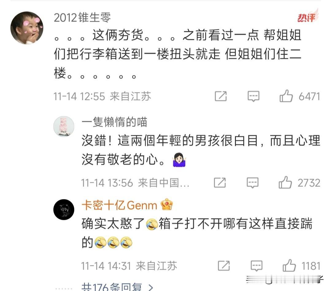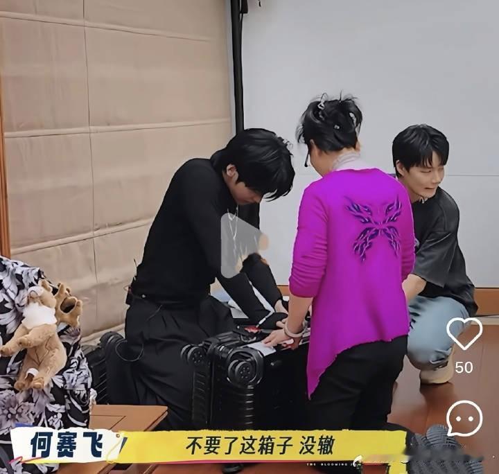 节目中,何赛飞坐在床上哭了,两位年轻的男嘉宾被骂惨了! 11月14日,关于“何赛飞因行李箱被踹坏爆哭”的词条上了热搜,瞬间引发热议,评论区也挺热闹。 从网上晒出的视频来看,大概的意思,何赛飞的行李箱打不开了,两位男嘉宾一起来帮忙,三下五除二,一顿操作猛如虎,用脚直接踹开了,箱子也坏了,这哥俩咯咯笑的很开心,应该觉得挺有自豪感。 何赛飞看到这一幕,坐在床上哭了,这哥俩瞬间有点懵了,赶紧问何老师,是不是很喜欢这个行李箱? 何赛飞老师表示,也不完全因为行李箱,说着就赶紧用衣服去挡住摄像头,估计不想让观众看到伤心哭泣的画面。 然而,这两个男嘉宾被网友骂惨了,觉得这俩哥们做法太鲁莽,直接上脚踹,完全可以借助工具打开,嬉皮笑脸的,一点不知道尊重长辈,何老师这个年龄的人,平时一定很节约,估计箱子用了很多年了,伤心是必然的。 有一说一,两位嘉宾挺年轻,确实鲁莽了一点,毕竟一个行李箱,觉得坏了也无所谓,而且何赛飞也说了,没辙,不要了,所以,不能都怪这俩哥们,也是好心帮忙。 说实话,一开始想过节目效果,也觉得何老师有点矫情了,仔细想想,以何赛飞这直率的性格,可能性不大。 个人觉得,有没有可能,何赛飞老师觉得年龄大了,连个行李箱都打不开,要不也不至于弄坏,所以,心里很难受。 另外,人上了年纪容易比较感性,虽然不知道何赛飞老师难过的原因,这俩哥们也没啥错。