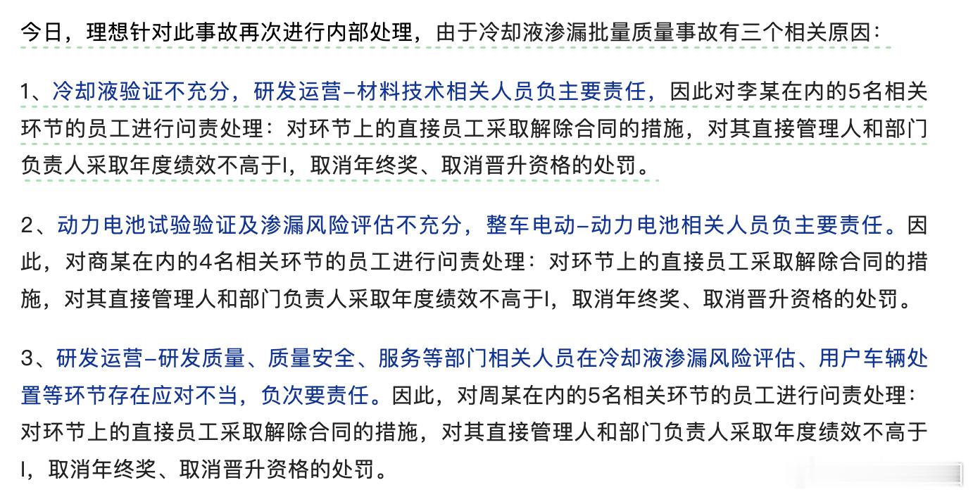 理想汽车启动内部问责的两起批量质量事故,这次不是小问题,理想内部直接处理了 14 名员工。1)MEGA 起火事情起因是 10 月 23 日,一辆 2024 款理想 MEGA 行驶中突然起火。理想内部随即自查,结果发现:同批次车辆里,冷却液的防腐性能不足,会在特定条件下腐蚀冷却铝板,导致冷却液渗漏。最严重的后果是什么?——可能引发动力电池热失控,理想召回了 11411 辆车。今天公布的内部处理显示:冷却液验证不充分、电池试验验证不足、以及质量安全环节应对不当,合计 14 人被问责,其中多名直接责任人被解除合同,部门负责人年度绩效不高于 I,还取消年终奖和晋升资格。2)L 系列“前轮异响”另一起是最近车主集中吐槽的 2025 款 L6/L7/L8/L9 前轮异响。很多用户新车提车没多久就发现问题,有人甚至说:几十万的车,开一个月就不敢开了。理想给出的原因是:新型号液压衬套油脂在高温下黏度变化,会导致偶发噪音,不影响安全,7 月底已解决。影响到了品牌口碑,理想对负责智能底盘的 4 名员工也进行了问责,同样有人被解约、有人取消年终奖和晋升资格。并且为 7 月 31 日前交付的车辆额外提供 3 年或 6 万公里的前悬延保。这两起的共同点很明显:验证不足 + 反应不够及时。理想这次连续问责 14 人,传达的信号也很强:质量问题不再遮掩,必须动真格。
