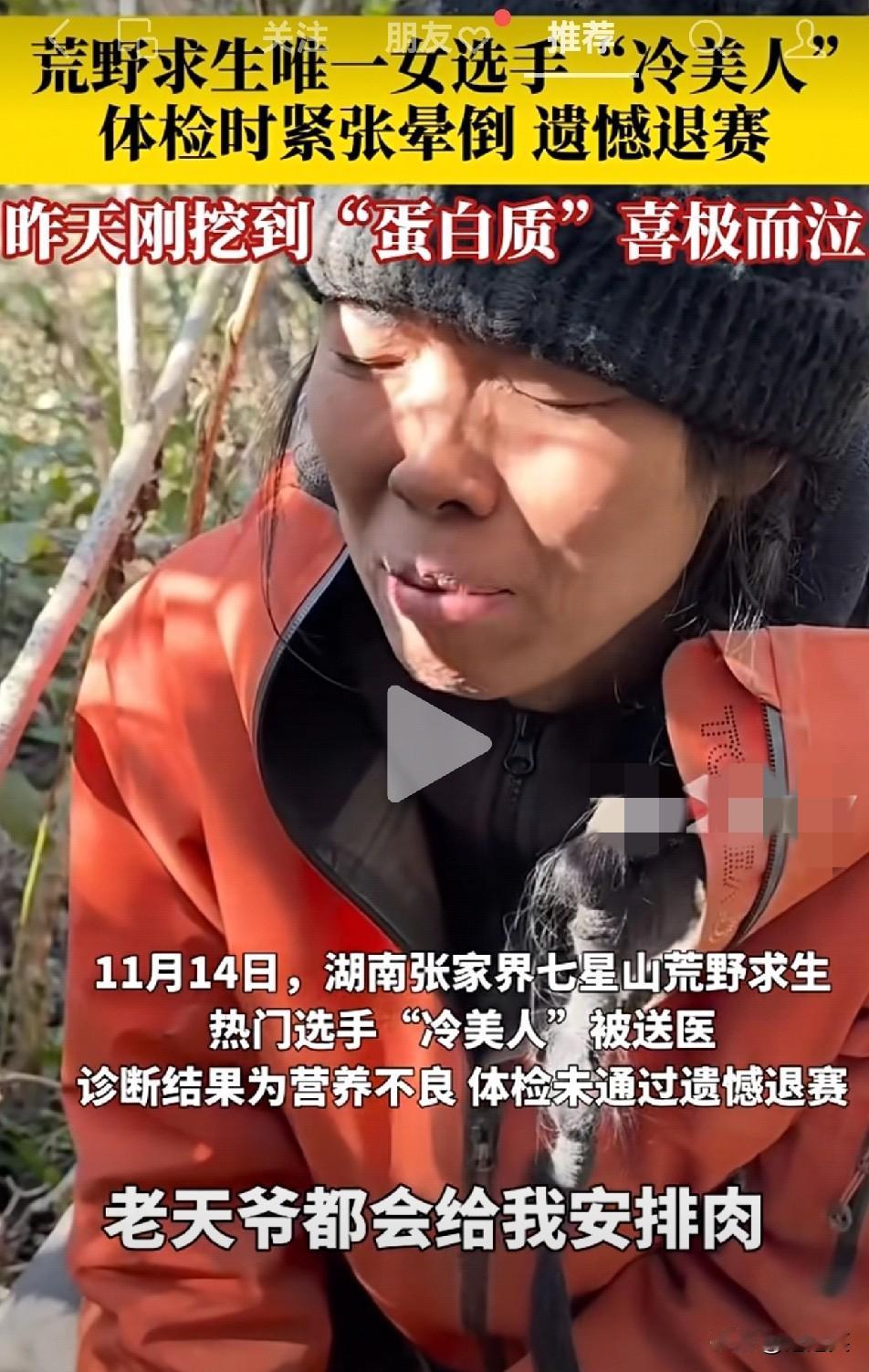 你说邪门不邪门? 荒野“冷美人”刚哭着挖到蛋白质 隔天饿晕退赛 这赛是拼命还是生存? 七星山荒野求生赛,唯一女选手“冷美人”前一天挖到点吃的 哭到咧嘴喊“老天爷给肉了”,转天体检直接饿晕送医 两次生理期都硬扛的人栽在“没吃够”上 现在生存赛总吹“意志无敌” 可她这事儿戳破了底:37天的坚持,抵不过身体亮红灯 到底是“死撑到赢”算英雄,还是“认怂保健康”更懂生存 这赛比的是活下来,不是赌命啊