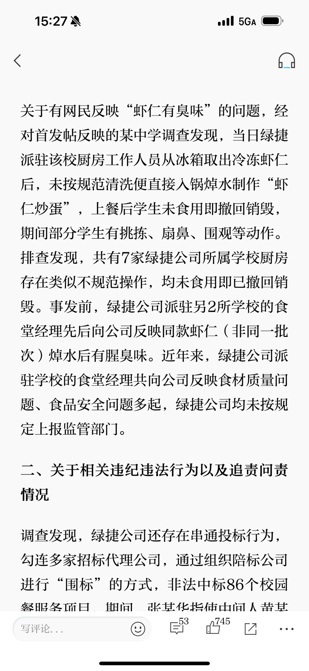上海绿捷8人被逮捕1.等于说,这批虾,在入境前,就已经生虫发臭了,那么是怎么检查把关的?2.食堂发现之后,没有上报,而是瞒报,这是不把食品安全,尤其是校园食品安全当回事;3.竟然不清洗,直接焯水制作餐食,完全不可思议!当然,也完全可以想象得到,毕竟,太多人不负责任了!4.串标,围标,这几乎不是什么奇怪的事儿了,只是出问题了说事儿了,那么怎么前置发现?要知道,凡是串标围标的,都是利益交换的,都是大概率有问题的,怎么避免?5.每次都是事情爆发了,才一查一连串的问题,这种发现机制,按理说也可以,但不能总靠舆论关注,毕竟,关注的都是少数!6.食品安全,尤其是校园食品安全,必须真正的重视起来,要知道,这还是大城市的情况!