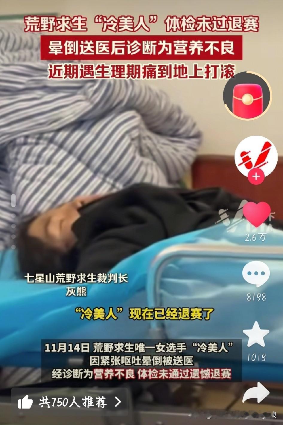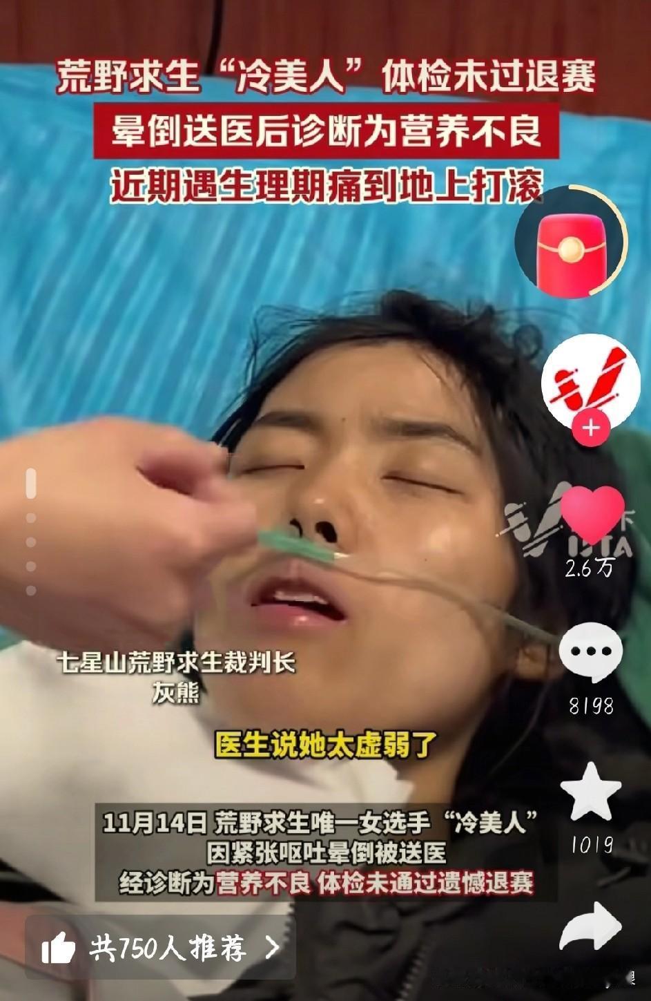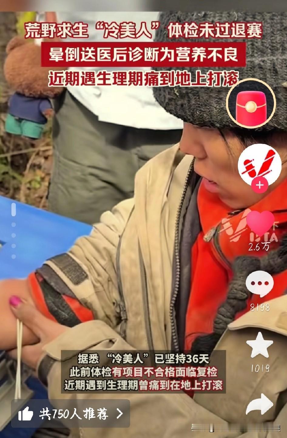 心疼!荒野求生冷美人坚持36天,体检不合格遗憾退赛 张家界荒野求生赛传来消息,唯一的女选手“冷美人”杨朝芹,因体检没通过遗憾退赛了! 这姐们是真能扛,带着一把柴刀参赛,36天里采野果、吃蝗虫,脸从圆润瘦到凹陷,手指嘴唇都裂了。生理期第二天就上赛场,后来痛到在地上打滚,还遇上暴雨冲坏庇护所,浑身湿透也没放弃,嘴里一直喊着“越是绝境,姐越冷静”。 结果14号体检查出营养不良,血糖、心电图都不合格,还晕倒送医了。醒了第一句话就是“不甘心”,看着真让人心疼。 虽然没拿到20万奖金,但她挑战自我的样子已经赢了。你觉得她这36天的坚持值吗?荒野求生“冷美人”体检未过退赛 图片截图于网络