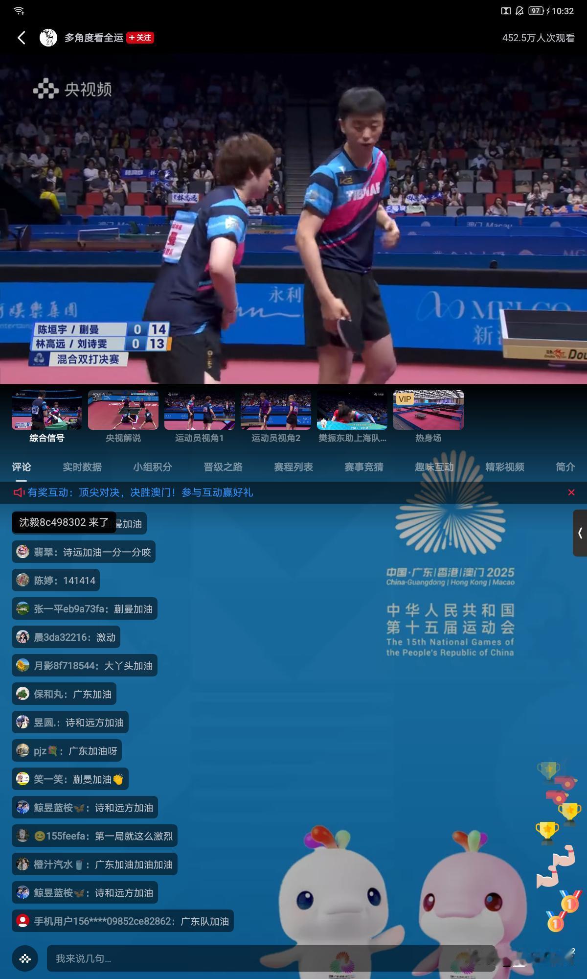 林高远和刘诗雯对蒯曼和陈垣宇的混双比赛太激烈了!第一局就打爆分了,15比13蒯曼和陈垣宇先下一局。两对选手都很强,两位老将大赛经验足,两位小将冲劲大,谁输谁赢还真不好预测。两对都喜欢,谁赢都高兴!不过作为一个江苏人还是给蒯曼和陈垣宇加油吧!