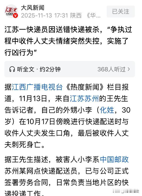 江苏苏州,快递员因为系统定位偏差的缘故,将快递误送到离女客户家几百米远的站点。等快递员联系上客户后,对方情绪十分激动,拉上丈夫找到快递员理论。争执间丈夫突然拿刀刺向对方,最终快递员重伤不治遗憾离世。 济南日报十一月十四号报道了一则快递员因送错快递被客户当街杀死的行为,案件的详情是这样的。 小周(化名)为人本分善良,今年三十岁的他作为家里的顶梁柱,在亲戚的介绍下,在苏州邮政某网点从事快递配员的工作,也和公司签订了正式的劳务合同。 为了多赚钱,小周干起活来十分卖力,在他负责配送的那片区域做的风生水起。 司机来到十月十七号晚上的七点左右,小周还在加班配送快递,当他按照系统定位来到目的地时,和客户王女士(化名)家的位置还差了好几百米远。 这本来是件微不足道的小事,在发现送错地址后,小周第一时间就联系王女士说明情况。 不知道怎么回事,小周打了七八次电话,对方都显示无人接听。 小周暗道倒霉,眼看手里还有几个快递要送,没办法只得继续联系对方。 好在这次电话终于接听了,但接电话的是一个男子,态度也十分差。 小周顾不上这些,赶紧解释情况,希望对方能理解。 王女士也是个暴脾气,在看到配送超时一下子就毛了,在询问小周现在的位置后,就挂断了电话。 被挂断电话的小周也是一脸郁闷:看来这人肯定不是个善茬,待会还不知道会发生什么呢! 小周的预感没错,王女士和丈夫找到小周后,二话没说就指着对方的鼻子骂了起来。 小周干这行也有段时间了,虽然大部分的客户都是讲道理的,但王女士这种蛮横不讲理的,也不在少数,碰到了就只能自认倒霉。 刚开始小周还耐着性子解释,并拿出手机证明自己没有说谎,可对方根本不管这些,话也越说越难听。 小周毕竟也是个血气方刚的男人,在低声下气解释半天后,对方仍选择不依不饶,他的声音也慢慢大了起来。 争执间王女士的丈夫不知道受了什么刺激,冷不丁的掏出事先准备的小刀,随即朝着小周捅了过去。 还不等小周反应,小刀就深深的刺进了他的肚子,随后小周就痛快的倒了下去,很快大片鲜血就涌了出来。 这里的动静吸引了路人的注意,有人报警,也有人拨打了120. 遗憾的是在救护车赶来之前,小周就因为大出血当场死亡。 小周的后事由叔叔周先生负责,但事件都过去了大半个月,在后续赔偿方面,一直没有进展,于是他就求助了调解员。 在听取完事情的经过后,在11月13号这天,调解员先是联系了小周工作的网点,对方表示小周确实是他们的正式原因,但关于具体的细节,他们也表示不清楚。 没办法调解员又联系了民警,对方表示案件还在调查中,随后也挂断了电话。 那么,从法律角度,如何怎么看待这件事? 1、如何判定王女士责任的法律责任? 根据《刑法》第二百三十二条规定:故意杀人的,处死刑、无期徒刑或者十年以上有期徒刑;情节较轻的,处三年以上十年以下有期徒刑。 从故意杀人罪构成条件来看:主观上丈夫持刀攻击快递员,明知其行为可能导致对方死亡,仍故意实施,有放任死亡结果发生的间接故意;客观上,其持刀刺杀的行为和快递员死亡结果,存在直接因果关系。 在相关司法实践中,这种因为琐事就当街行凶致死的恶性案件,一般会被判无期甚至死刑,特别是丈夫还是主动携带刀具,其量刑必然会进一步加重。 2、小周的家属将如何维权? 《工伤保险条例》第十四条明确了应当认定为工伤的七种情形:在工作时间和工作场所内,因工作原因受到事故伤害的;工作时间前后在工作场所内,从事与工作有关的预备性或者收尾性工作受到事故伤害的;在工作时间和工作场所内,因履行工作职责受到暴力等意外伤害。 小周是在送快递期间,因系统故障导致定位错误,在和客户沟通过程中发生争执并遇害,符合上诉条款的规定,其行为构成工伤的认定情形。 在这个前提下,家属可依法向其工作站点申请工亡赔偿,其中包括丧葬补助金、一次性工亡补助金等。 如果单位给小周提前缴纳了工伤保险,相关费用可由保险支付;如果没有购买保险,那么相关费用将由单位承担。 除了单位的赔偿外,家属还可以向王女士丈夫申请民事赔偿,根据《民法典》第一千一百七十九条的相关规定,家属可依法要求对方赔偿丧葬费、死亡赔偿金等损失。 目前,王先生每天都守在网点讨说法,可事情也过去了有一段时间,单位方面除了表示会配合调查,但没有负责人主动联系家属,协商善后事宜,令人心寒。 至于王女士方面,她丈夫已被刑拘,但案件具体进展仍未正式公布。 那么,对于这事你怎么看?评论区见!