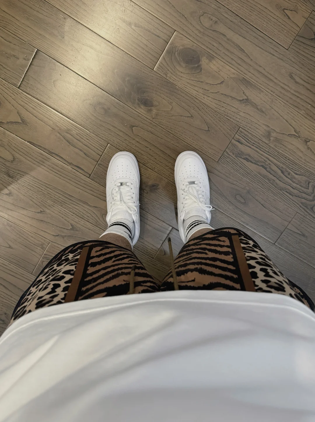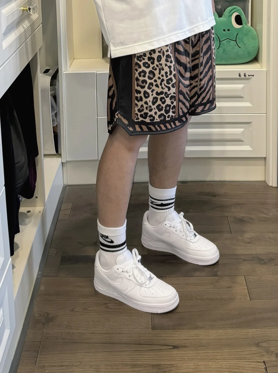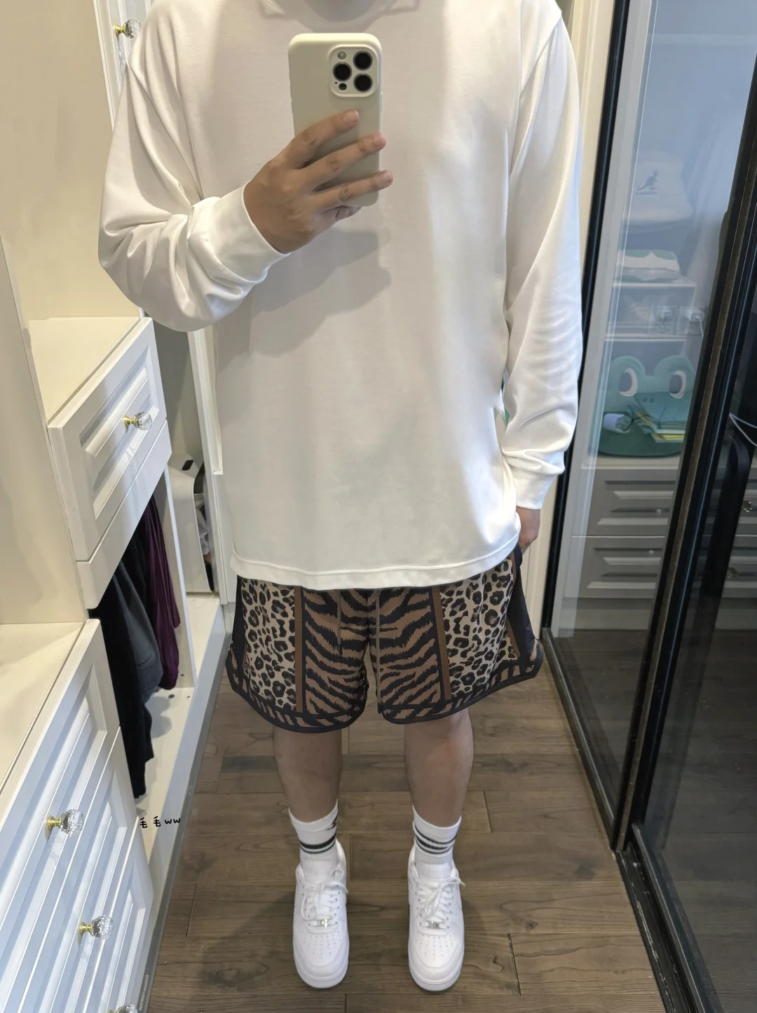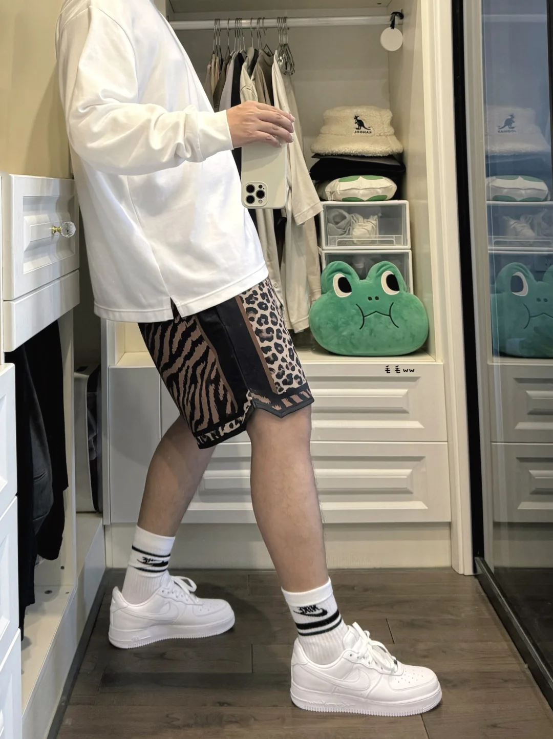 -白Tee白袜小白鞋,对比色让下装的豹纹短裤格外醒目;深沉不乍眼的棕色调,喜欢拼接的不对称细节 . —————— . 👔Uniqlo U / 465193 // XXL . 🩳Hyperkiller // XL . 👟Air Force 1 / NOCTA // 42 . —————— . ✏️本人178cm75kg 球鞋尺码265mm(正常EU42) . 💭以上均为我个人观点,不喜勿喷,欢迎讨论。