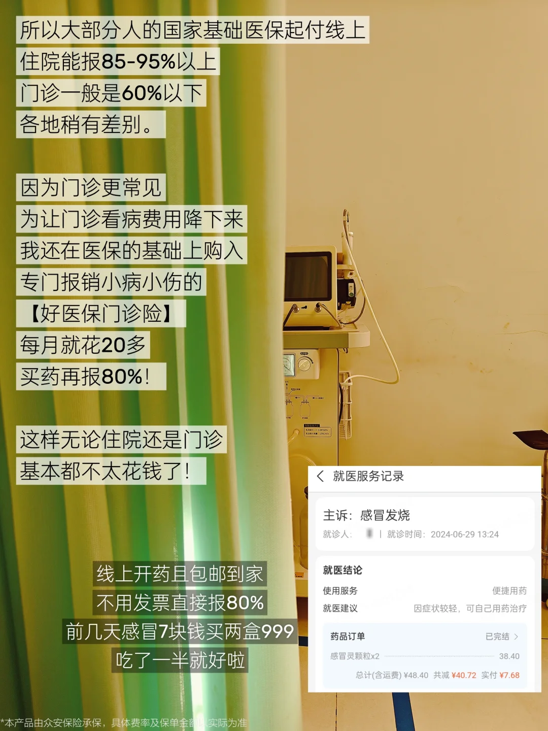 关于报销额度这块,国家给的基础医保住院起付线上能报85-95%以上,门诊一般是60%以下,各地稍有差别。像日常门诊使用较多的朋友,如果想少花💰,可在医保的基础上再购入专门报销小病小伤的【好医保门诊险】,每月就花20多,看病买药再多报50%-80%!一年下来能省不少👇
