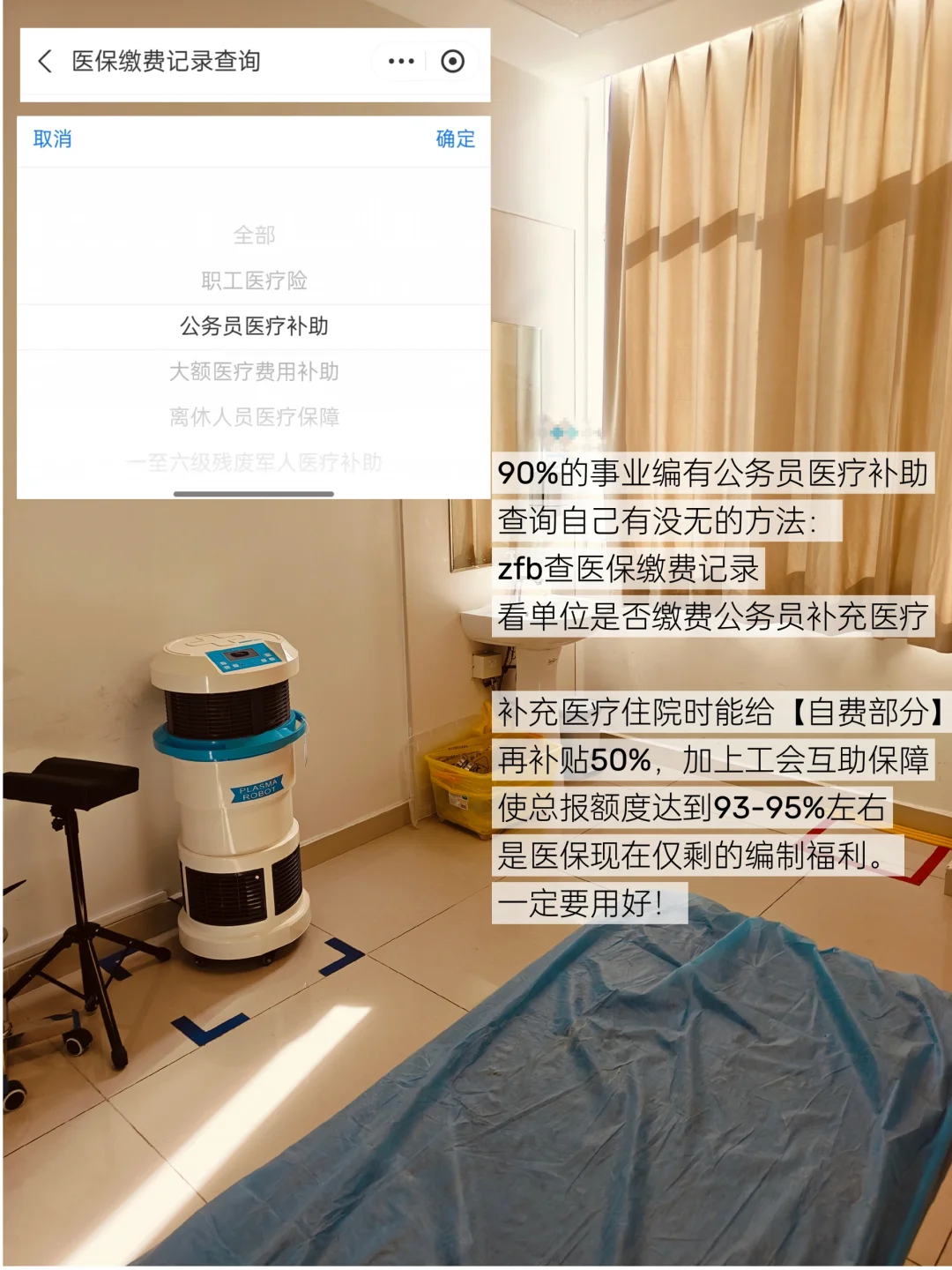[二R]90%的事业编有公务员医疗补助。查询自己有没无的方法:zfb查医保缴费记录,看单位是否缴费公务员补充医疗。补充医疗住院时能给【自费部分】再补贴50%。使总报额度达到93-95%左右。是医保现在仅剩的编制福利。