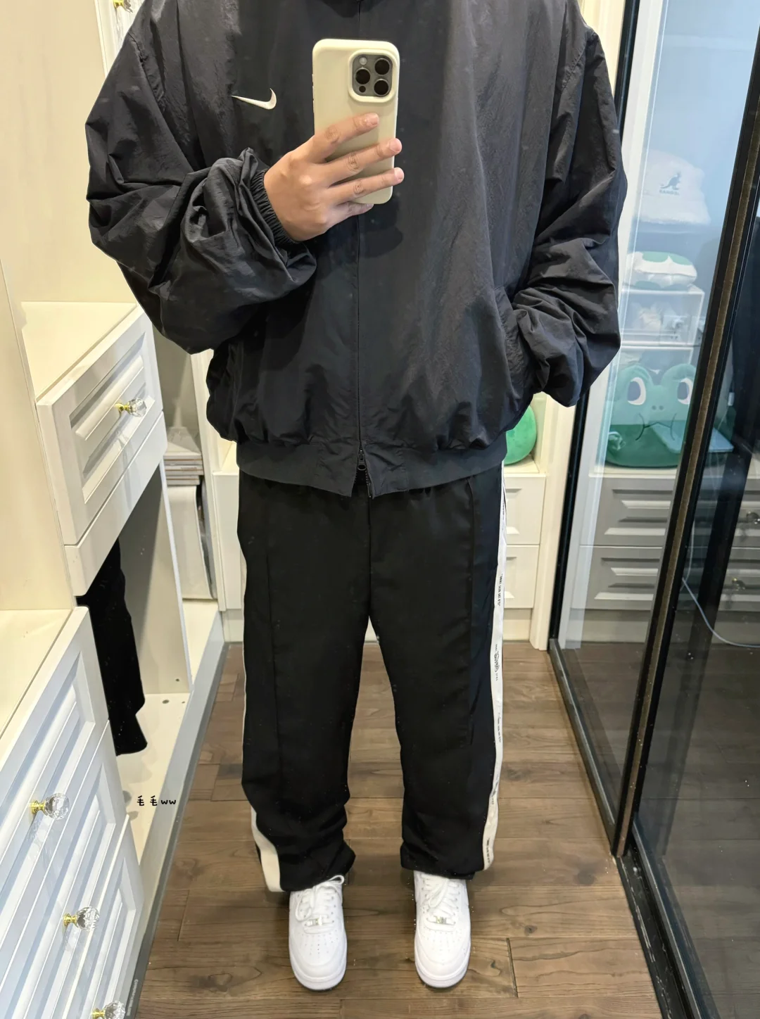 -终于回温了,可以脱下厚重的冬装,短宽的复古外套,直筒的条纹长裤 . -整套黑色系搭配,使得小白鞋更亮了,没有过多的修饰,主打干净简洁 . —————— . 👔Nike Fear of God // L . 👖Coca-Cola / 可口可乐 // XL . 👟Air Force 1 low / NOCTA // 42 . —————— . ✏️本人178cm75kg 球鞋尺码265mm(正常EU42) . 💭以上均为我个人观点,不喜勿喷,欢迎讨论。
