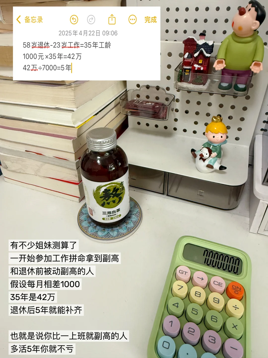 看太多人为了职称、职级、荣誉拼到抑郁,可是有姐妹测算过了!咱们23岁参加工作,58岁退休。一开始参加工作拼命拿到副高,和退休前被动副高的人,假设每月相差1000,35年是42万。退休后5年就能补齐。