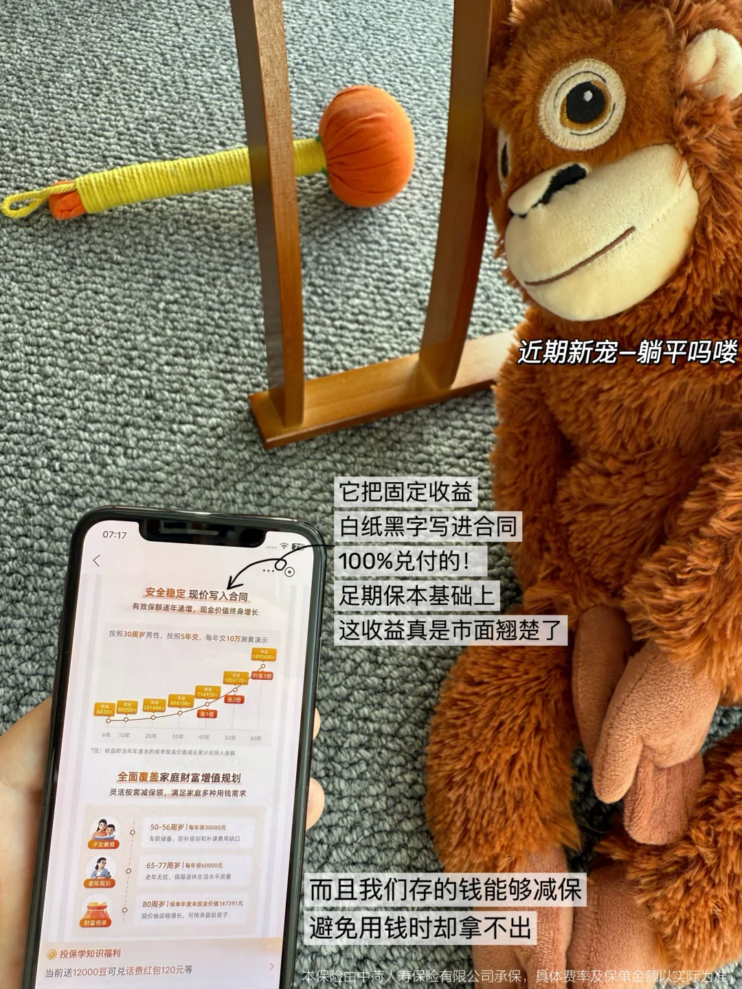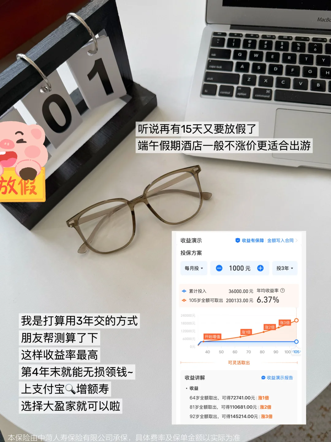 我是打算用3年交的方式,朋友帮测算了下,这样收益率最高。第4年末就能无损领钱~购买金额累计到50万,还能免费赠送旅居一次,我要继续加油啦。