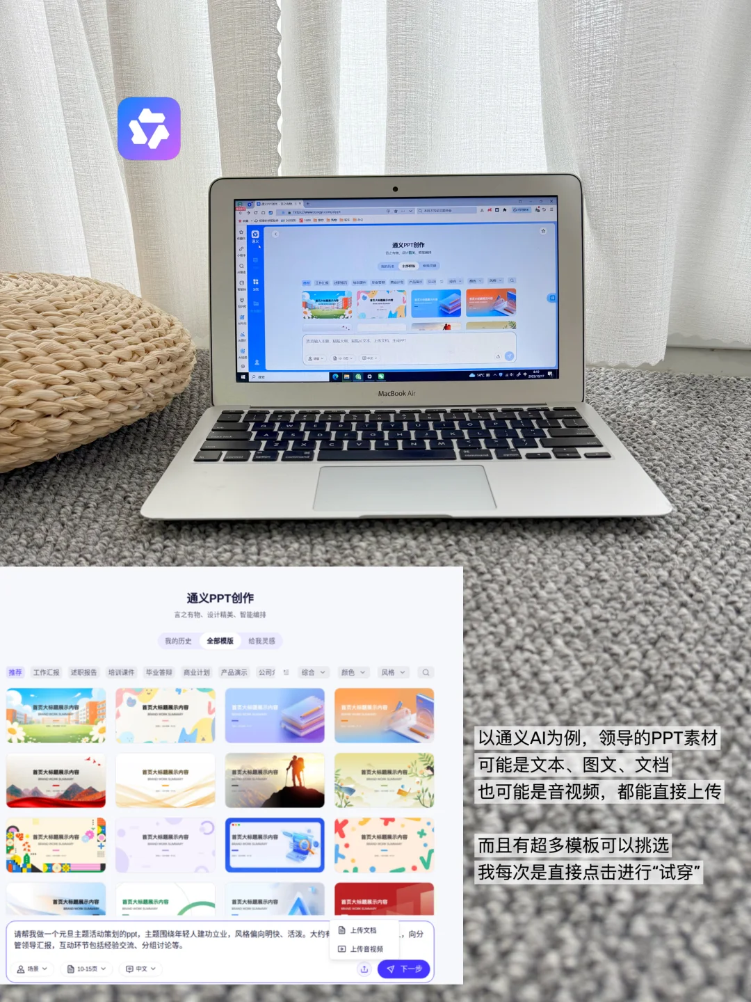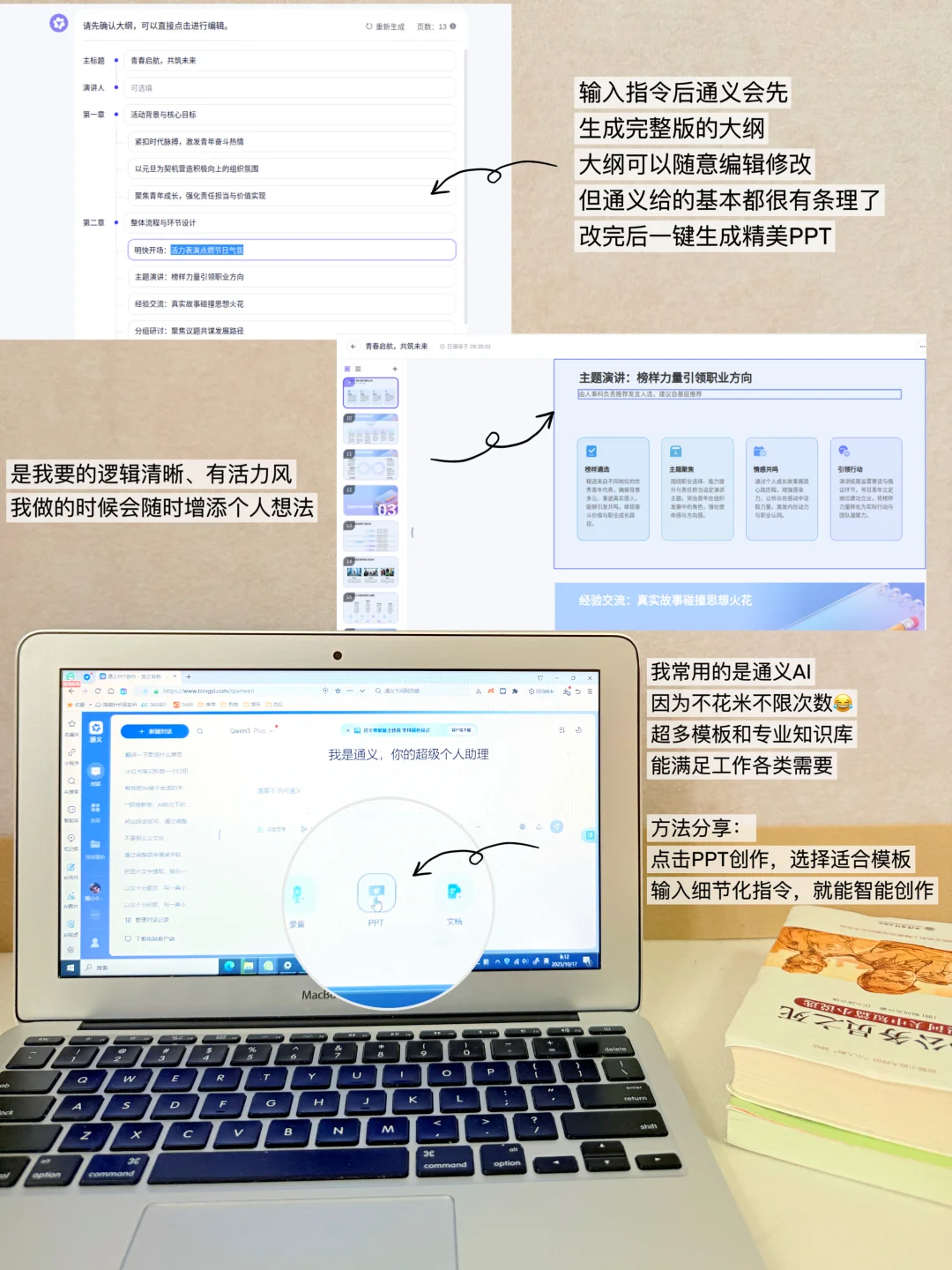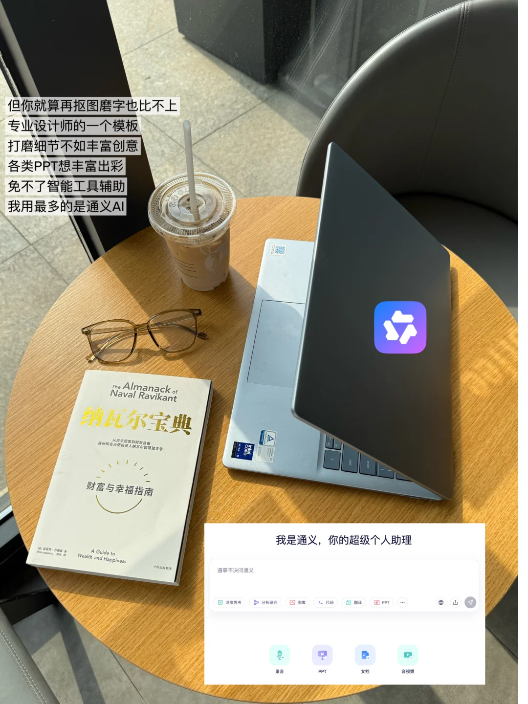 你再抠图磨字也比不上专业设计师的一个模板。打磨细节不如丰富创意,PPT想丰富出彩,免不了智能工具辅助,我常用的是通义AI,因为不花米🆓不限次数,超多模板和专业知识库,完全满足工作要求。方法分享:点击PPT创作,选择适合模板,输入细节化指令就能智能创作,常见三种: