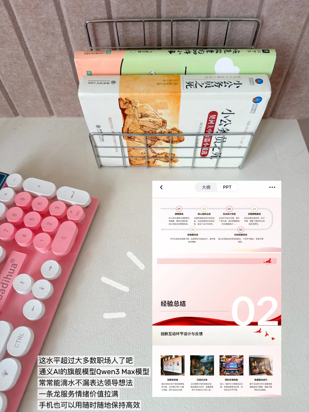 ✓多种形式转换。领导的PPT素材可能是文本、图文、文档,也可能是音视频,可能让直接成稿,也可能要二次美化。可用通义AI的旗舰模型Qwen3 Max模型,滴水不漏表达领导想法。也可先用它智能写作再进行PPT制作,一条龙服务情绪价值拉满[红色心形R]