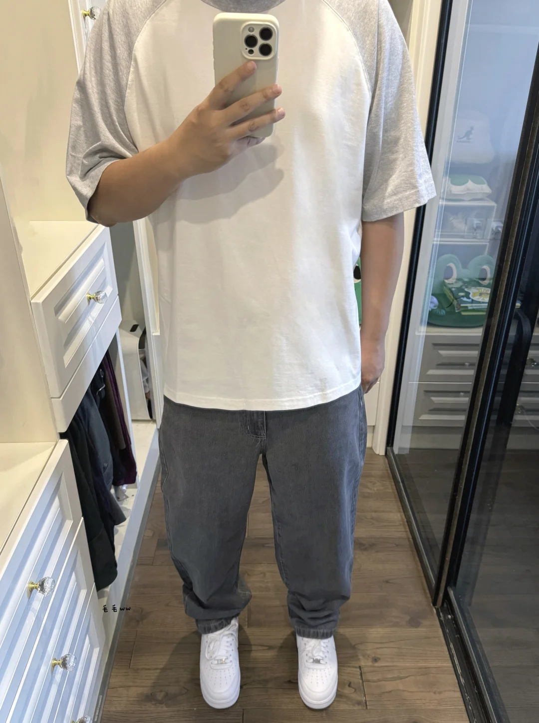 -拼色插肩袖穿搭,古白麻灰青灰,属于夏日的层次感;直筒牛仔裤日常百搭,鞋柜再挑一双小白鞋即可 . —————— . 👕Uniqlo / 475366 // XL . 👖Teenie Weenie Men // XL . 👟Air Force 1 / NOCTA // 42 . —————— . ✏️本人178cm75kg 球鞋尺码265mm(正常EU42) . 💭以上均为我个人观点,不喜勿喷,欢迎讨论。