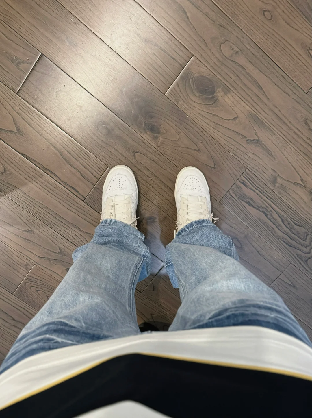 护膝不放裤子里面,放裤子外面,这绝对的人才,看不懂这是怎么一个穿法?还有一点