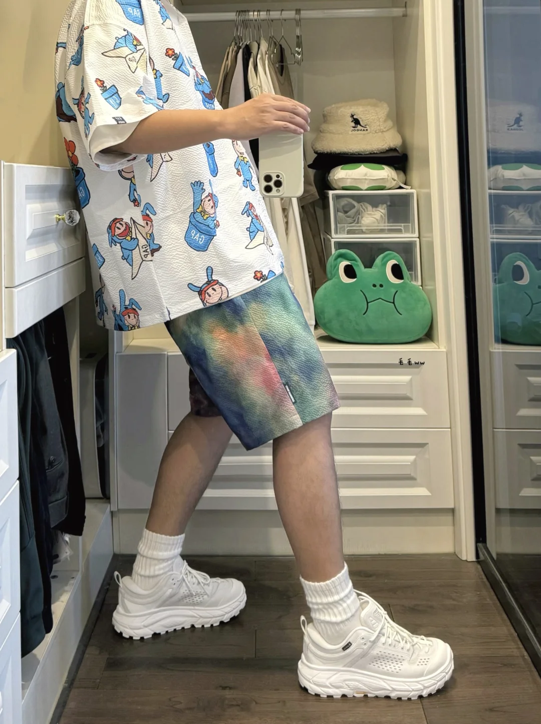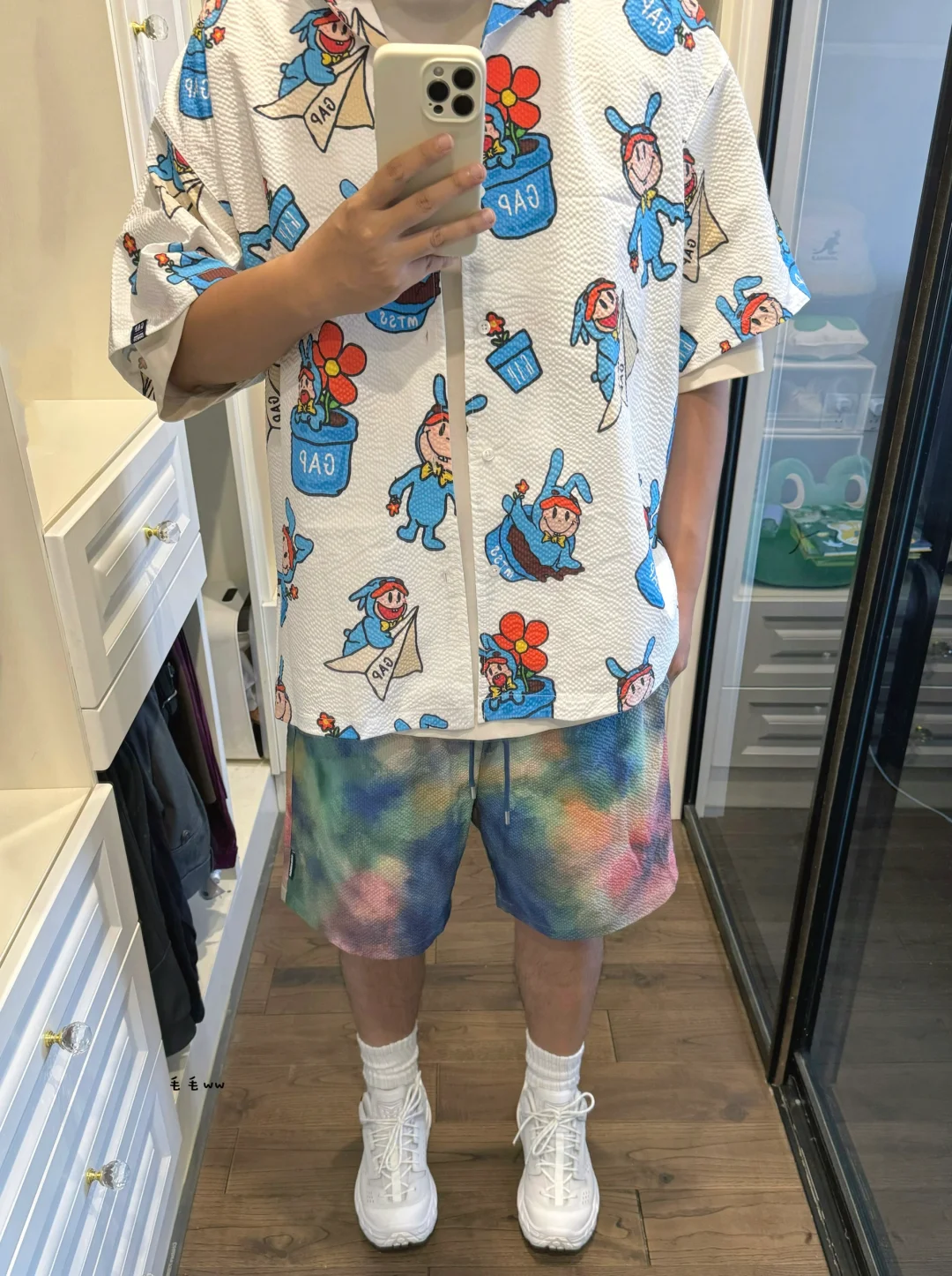-夏季多巴胺穿搭,满印衬衫&扎染短裤;泡泡纱这类材质,你真的会爱上,除了轻薄透气之外,不管怎么折怎么揉都不会变形 . —————— . 👕GAP / Melting Sadness // XXL . 🩳Expensive Taste // L . 👟HOKA One One / tor ultra // 42 . —————— . ✏️本人178cm75kg 球鞋尺码265mm(正常EU42) . 💭以上均为我个人观点,不喜勿喷,欢迎讨论