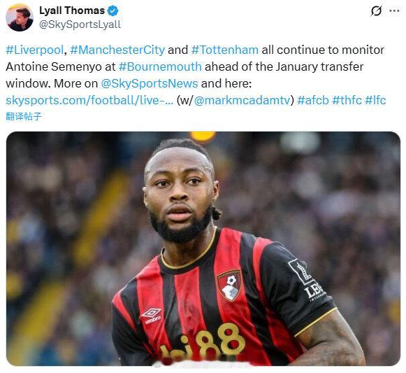 【英超三强有意引进塞曼约】天空体育消息,在一月冬窗开启前,利物浦、曼城、热刺都在关注伯恩茅斯前锋塞曼约的情况,他在今年夏窗刚与伯恩茅斯完成续约,他不会在冬窗要求离队,但是如果有豪门向樱桃军团开出高价,不排除冬窗转会的可能性。PS:伯恩茅斯只要在上半赛季抢到足够的份数,提前完成保级,不能排除他们同意高价出售塞曼约的可能性。