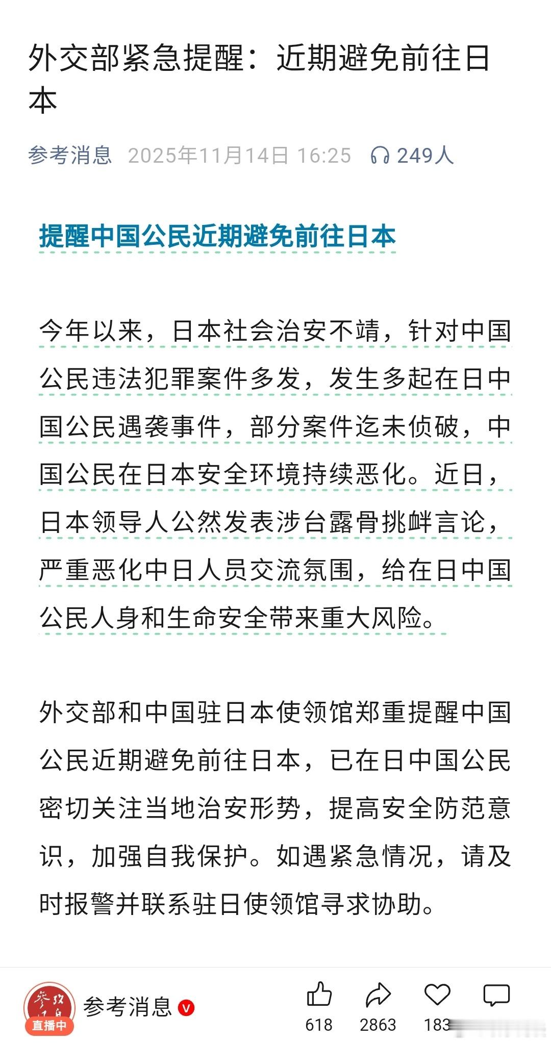 【外交部紧急提醒:近期避免前往日本】呼吁自觉行动