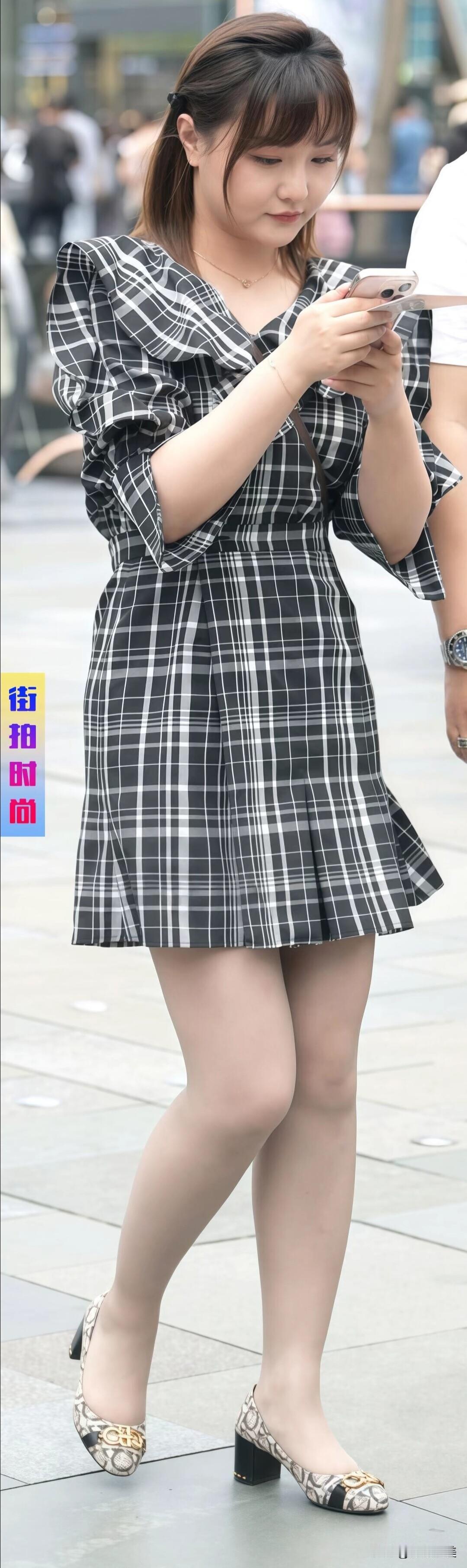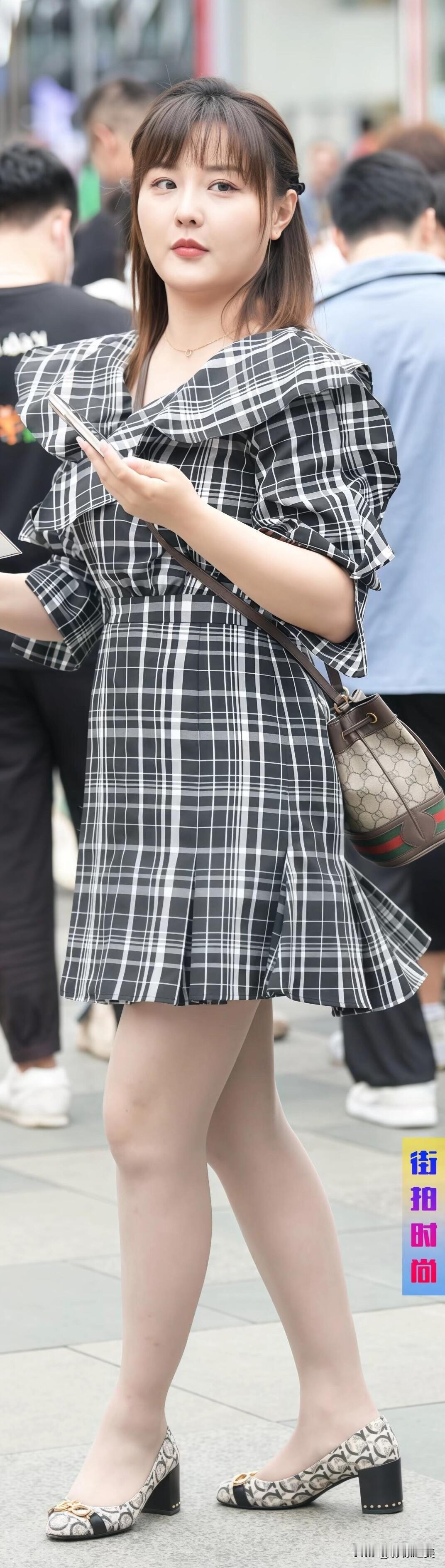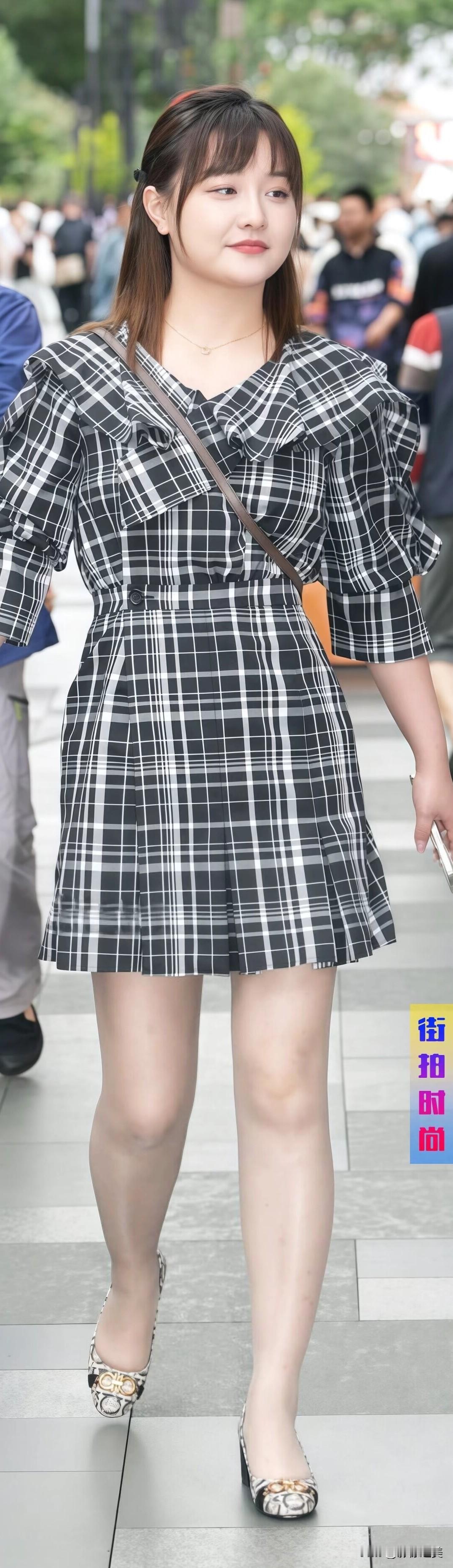 街拍偶遇甜妹!黑灰白格纹连衣裙+泡泡袖超减龄,搭配蛇纹单鞋慵懒又精致,笑容太治愈啦~