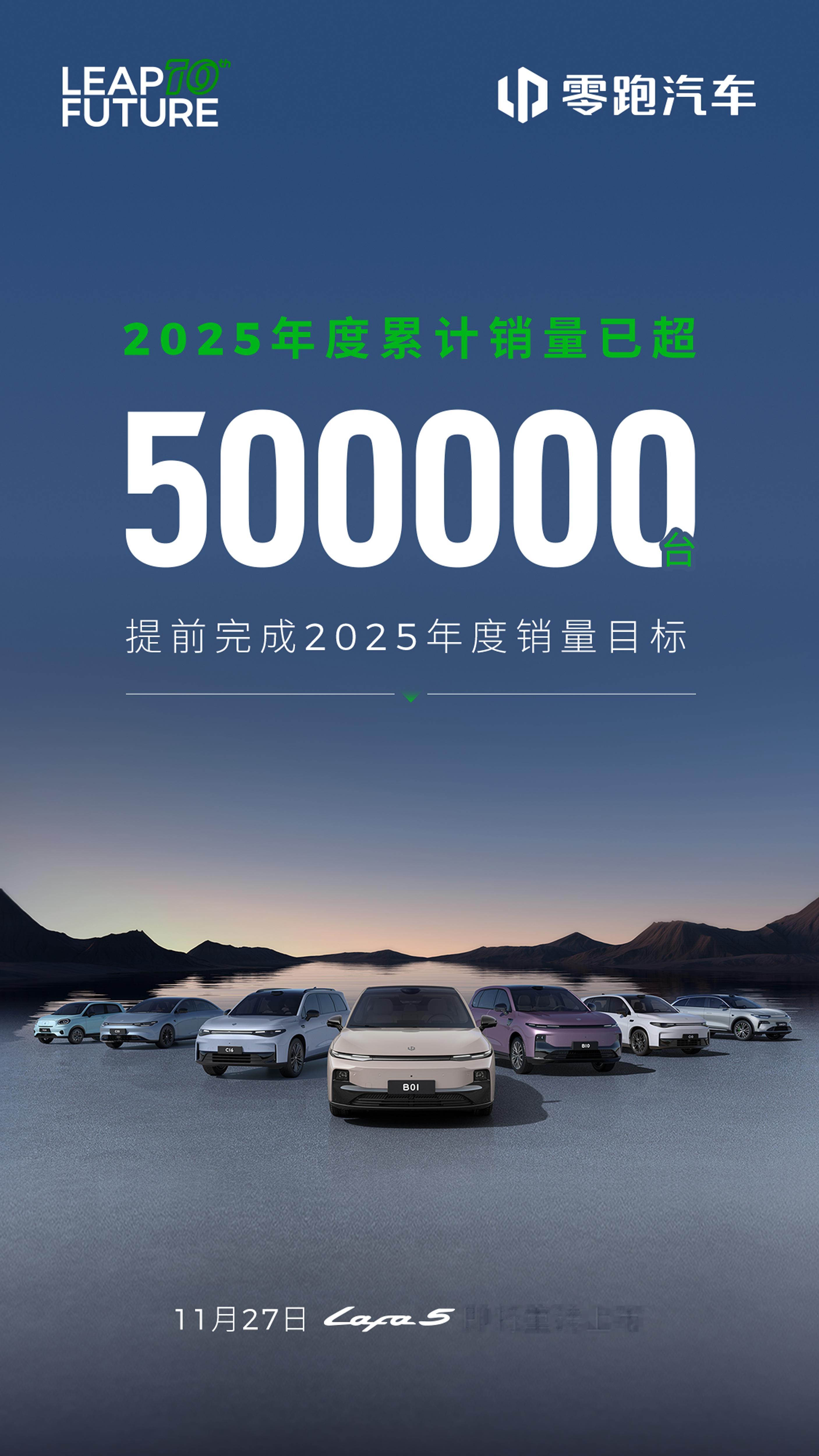 提前达成!2025年度累计销量已超50万台提前完成2025年度销量目标这份成绩单,由我们共同写就感谢每一位用户与零跑同行11月27日即将重磅上市,敬请期待!
