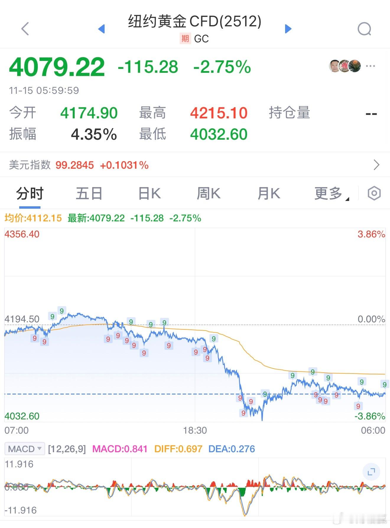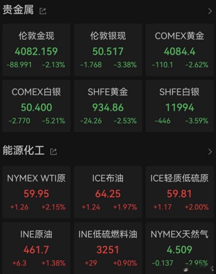 国际金价大跌。据Wind数据,当地时间11月14日,国际贵金属期货普遍收跌,COMEX黄金期货跌2.62%报4084.4美元/盎司,本周累计上涨1.86%;COMEX白银期货跌5.21%报50.4美元/盎司,本周累计上涨4.69%。国际油价上涨。美油主力合约收涨2.15%,报59.95美元/桶,周涨0.18%;布伦特原油主力合约涨1.97%,报64.25美元/桶,周涨0.97%。
