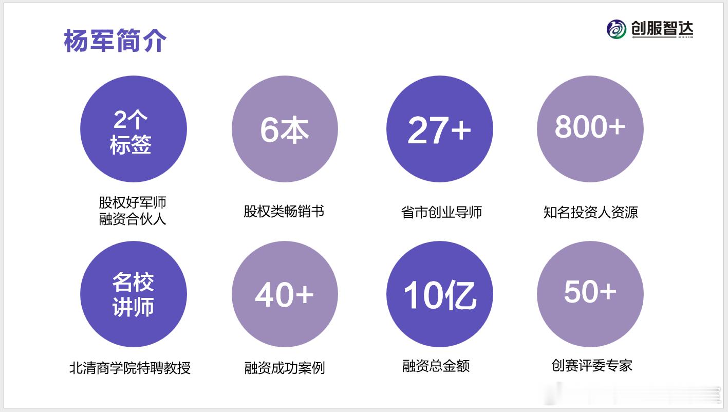 我在给创赛选手做培训辅导时说公司简介要用关键数字,不要大堆文字于是我把我自己的个人大堆简介,浓缩成了八个圆圈和关键字