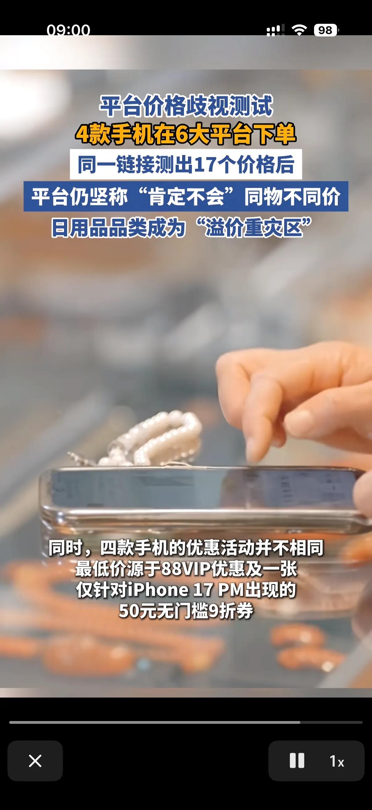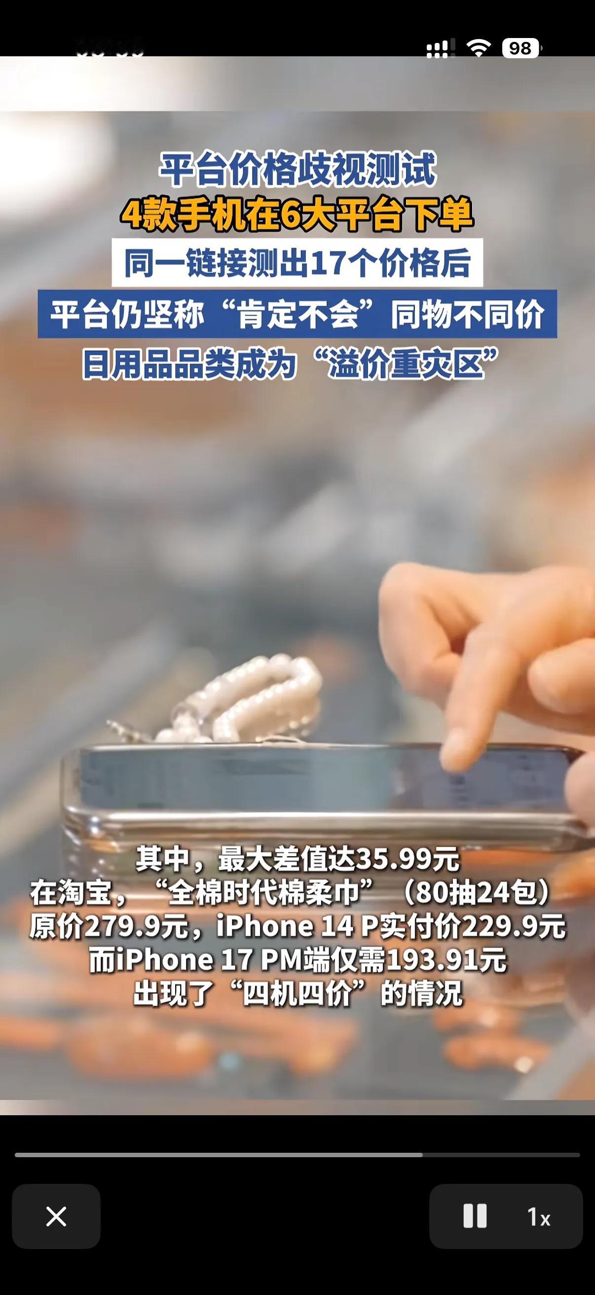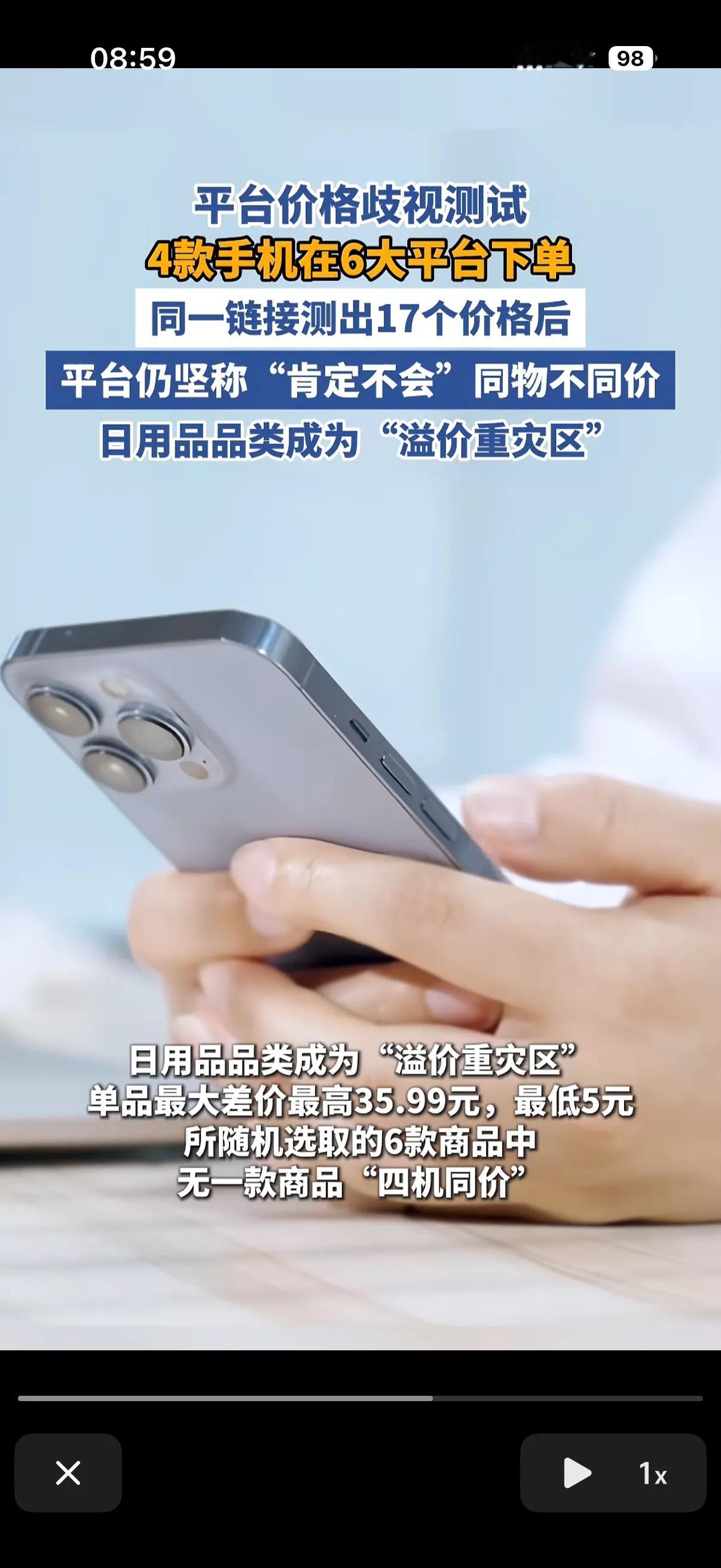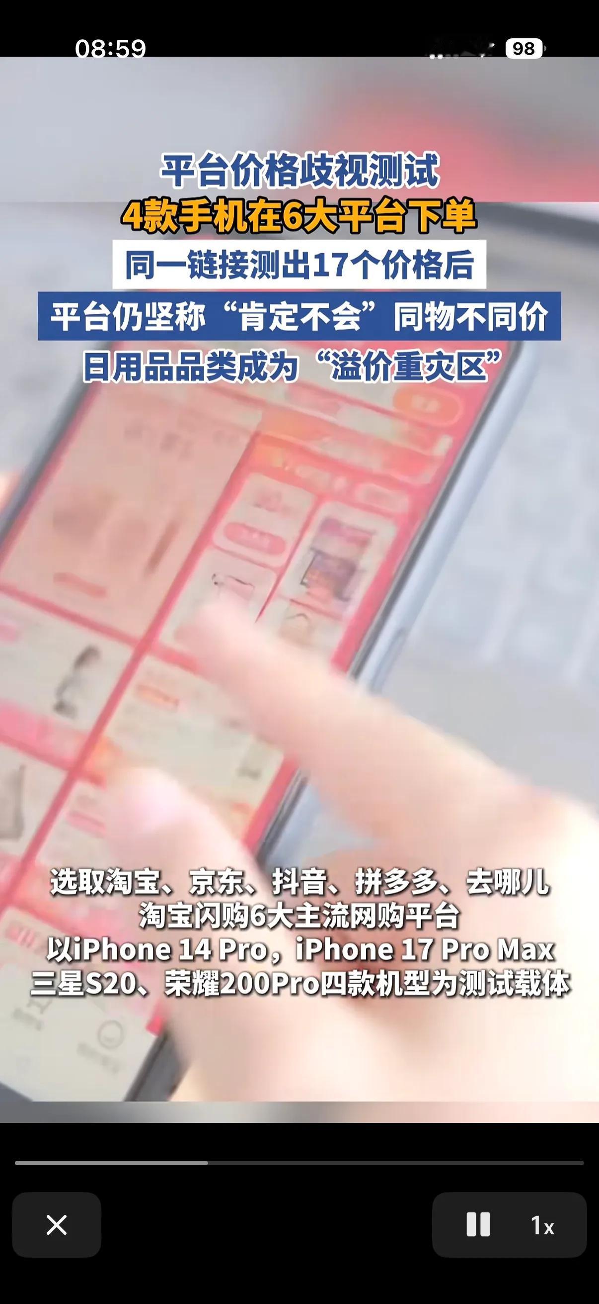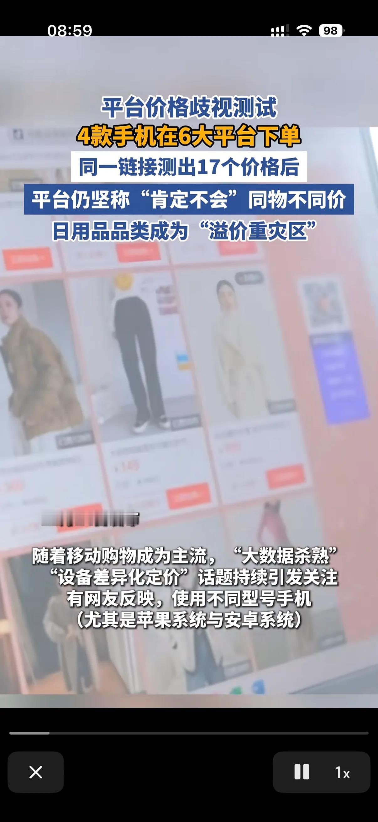 大数据杀熟,是每个网购人躲不开的坑! 现在网购已经是大家经常选择的生活方式了! 那么你知道你正在遭遇电商的大数据杀熟么? 有些人说我会货比三家!但是你所谓的货比三家是逃不过电商平台的大数据杀熟的。 你能逃过的无非是不被某一个商家杀熟,但是电商平台的这一刀是逃不掉额! 有媒体就电商平台大数据杀熟做了调查实验,用四部价格不同的手机在同一时间同一家电商平台同一家商户购买同一物品,你猜怎么着? 竟然出现四种不同的价格! 记者测试了多家电商平台,无一例外,都是存在电商平台大数据杀熟! 目前有电商平台出来辟谣说不存在大数据杀熟!只是说每个手机号回有不同的折扣券! 你相信存在大数据杀熟么?!