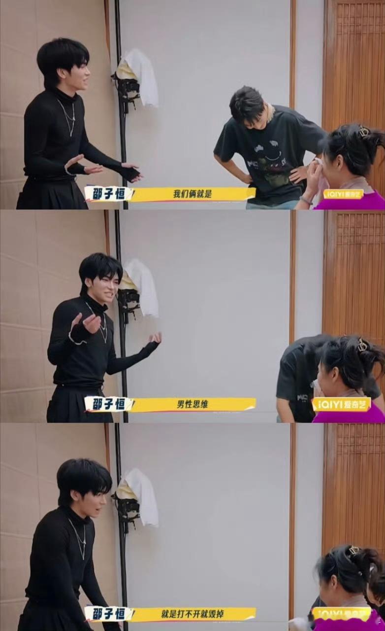 邵子恒帮何赛飞开行李箱,没打开还坚持硬开,结果何老师都急哭了。不过他很快反思,意识到自己男性思维处理方式不妥,这进步值得点赞~😃