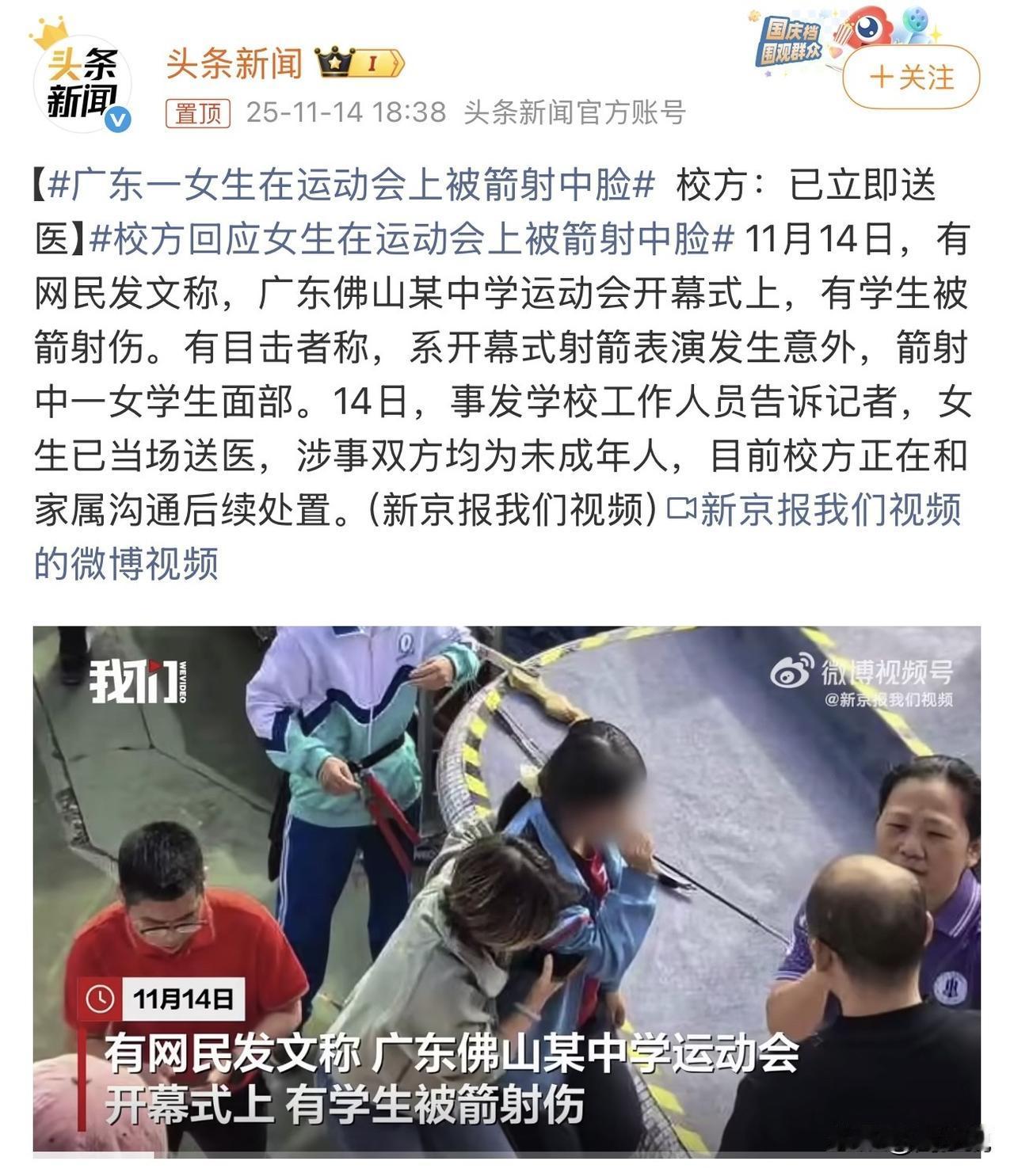 #MCN双量进阶计划#揪心!广东一中学运动会,女生竟被箭射中脸!校方回应:涉事双方均为未成年人,正妥善处理后续事宜! 11月14日,广东佛山某中学运动会开幕式突发惊魂一幕!原本精彩的射箭表演意外失控,一支箭矢径直射中一名女学生面部,现场众人瞬间揪心。 事发后,校方第一时间将受伤女生送医救治。针对此事,学校工作人员回应:“涉事双方均为未成年人,目前正全力与学生家属沟通,处理后续事宜。” 此事曝光后,网友热议不断。有网友质疑:“运动会安全保障太重要了!射箭这种项目怎么能没防护?” 还有网友则表示:“心疼孩子,希望没大碍,校方必须给个说法!” 看完这事,周少不得不说确实让人揪心。但细想发现,其实这场意外撕开了校园活动安全的漏洞。运动会本是青春绽放的舞台,却因安全管控不到位酿出风险。 未成年人安全无小事,尤其是射箭这类有危险性的表演,更需提前做好全方位防护、排查隐患。校方不仅要妥善处理后续,更该以此为戒,守住校园安全的底线。 对于女生在运动会上被箭射中脸,大家怎么看呢?#寻美三湘# #长沙新朋友#
