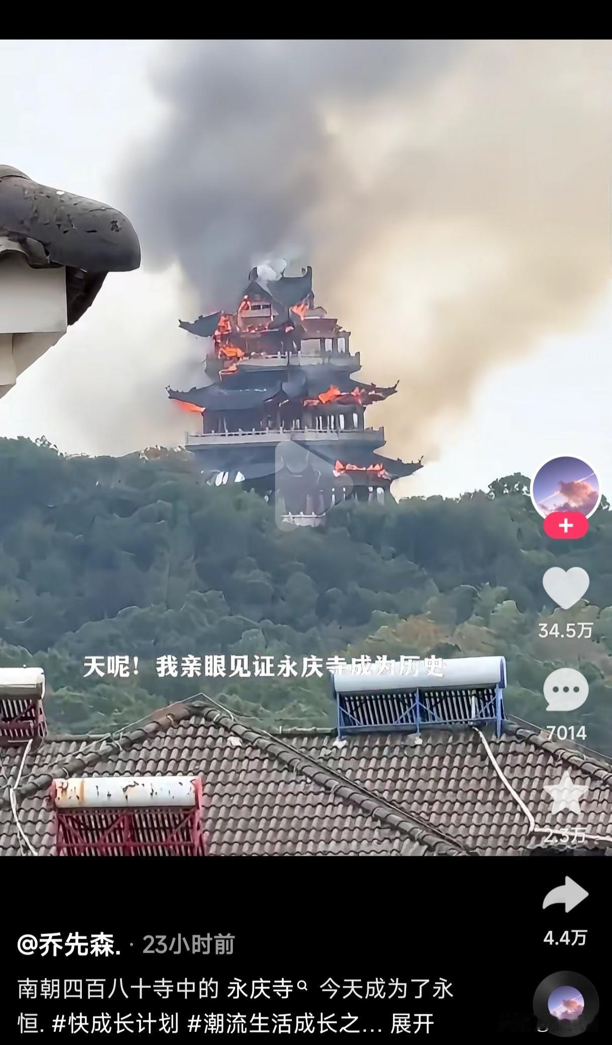这是真的还是假的? 南朝四百八十寺中的永庆寺居然成为了历史,网友亲眼目睹永庆寺在一场大火中化为灰烬,也就意味这座历史性的建筑物从此不复存在了。 在自然灾难面前任何古老的建筑物都不值一提,尤其是这种木材建筑的古老传统,只要遇到火灾就只能眼睁睁看着它化为灰烬,任何事物都会随着时间的沉淀而不复存在,但永庆寺以这样的方式沦为历史,确实让人觉得太可惜了。