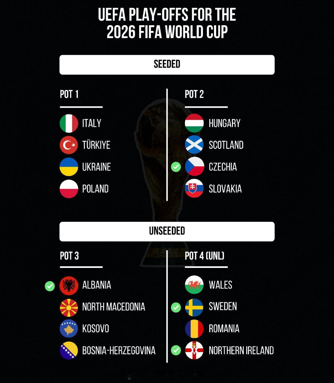【欧洲区附加赛形势】截止到11月15日,已经有4支球队确认拿到世预赛欧洲区附加赛的资格:捷克、阿尔巴尼亚、瑞典和北爱尔兰!其中,北爱尔兰是确定非种子队第4档,其余三队在附加赛在档位还没有确定。另外,意大利和波兰99.99%可能性要踢附加赛,并且还是种子队第1档。PS:欧洲区附加赛抽签,将在11月20日进行。