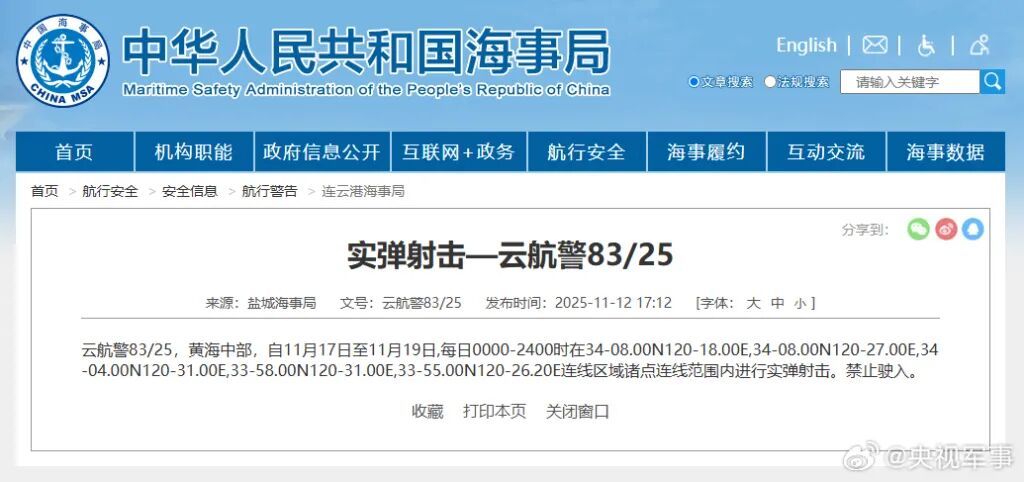 【连续3日,】据中国海事局网站消息,盐城海事局发布航行警告,11月17日至19日,每日0时到24时,黄海中部部分海域进行实弹射击,禁止驶入。