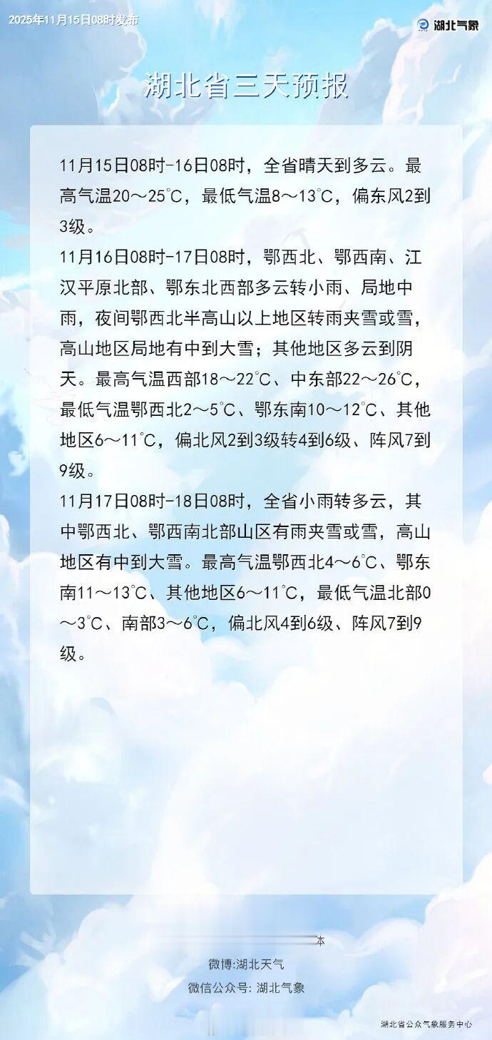 11月17日,全省小雨转阴天,十堰、襄阳、神农架、恩施北部、宜昌等地山区有雨夹雪或雪,1200米以上高山区有中到大雪。最高气温西部5~9℃、东部10~13℃,最低气温北部3~6℃、南部6~11℃。偏北风4~6级、阵风7~9级。