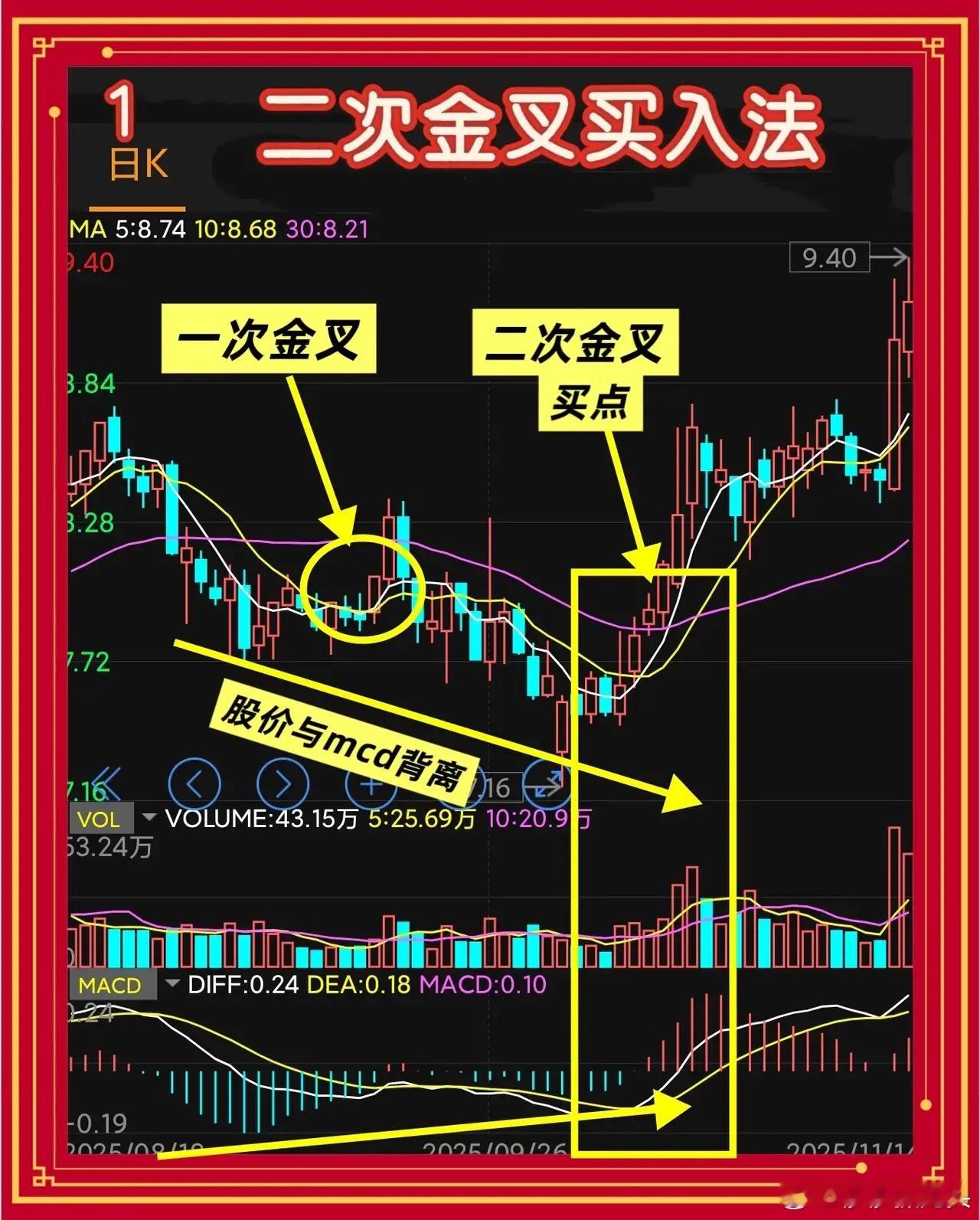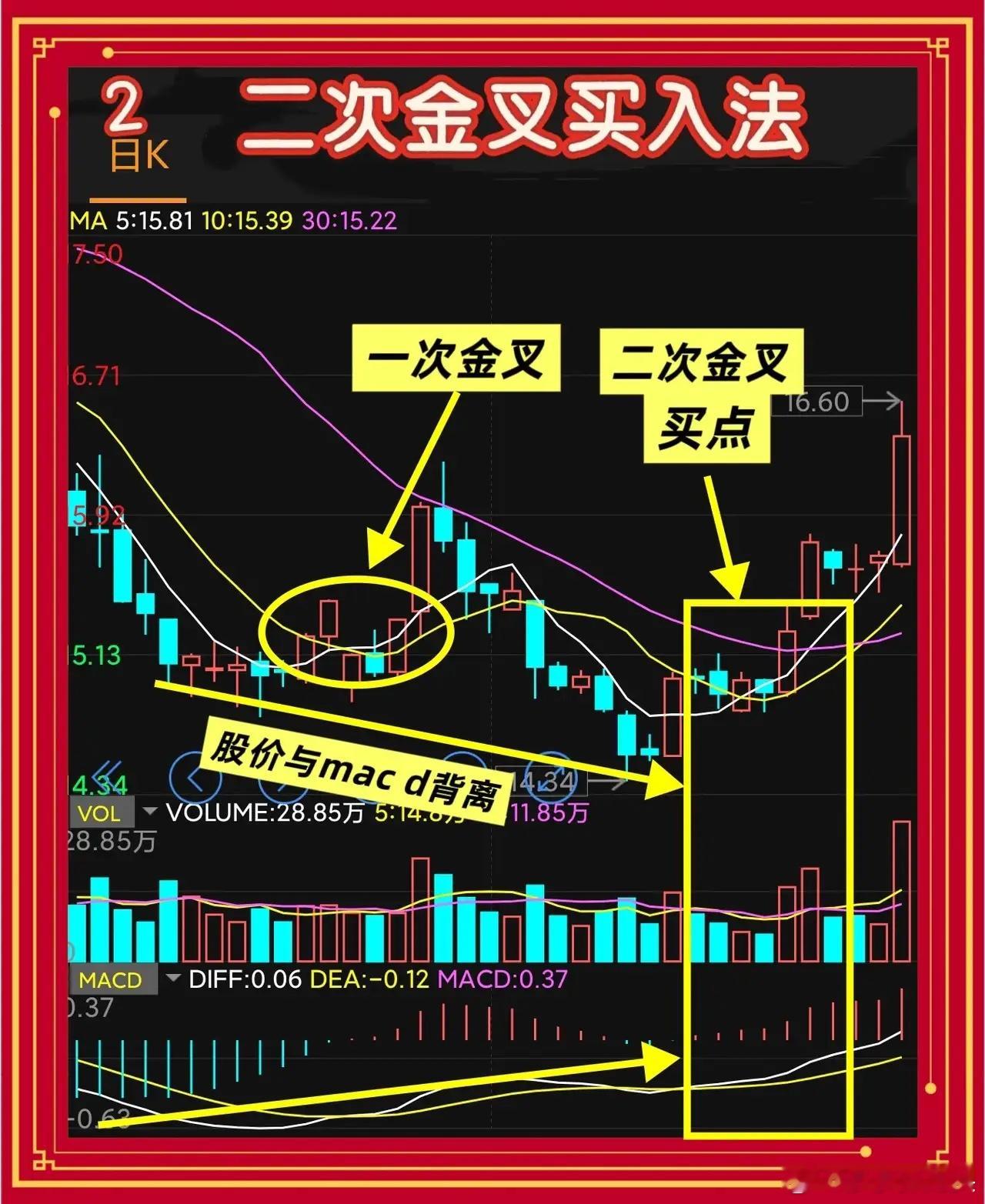 均线二次金叉买入法第一条,5日均线向上穿透10日均线形成金叉,选择第二或第三次金叉时介入,洗盘更充分,胜率更高。第二条,MACD同步完成两次金叉,红柱放大,多头能量获得官方确认。第三条,MACD最好提前走出底背离,价格创新低而指标抬升,警示空头力竭。第四条,第二次金叉当日,成交量必须明显放大,量比大于1.5,资金扫货痕迹清晰。第五条,若股价借此一举突破30日均线,短中期趋势共振,上行空间瞬间打开。第六条,此时如再出现5日均量线上穿10日均量线的“量叉”,量价齐升,信号强度直接拉满。 六环全部亮绿灯,再扣扳机;任何一环不符,果断放弃,宁可错过,不做错单。 觉得有用请点赞、关注、评论、收藏、转发,让更多朋友一起验证这套简洁模型。本文仅供思路交流,不做投资推荐。股市有风险,入市需谨慎。