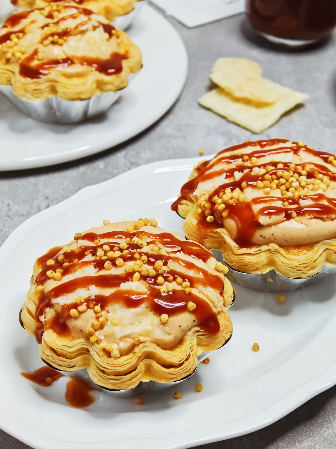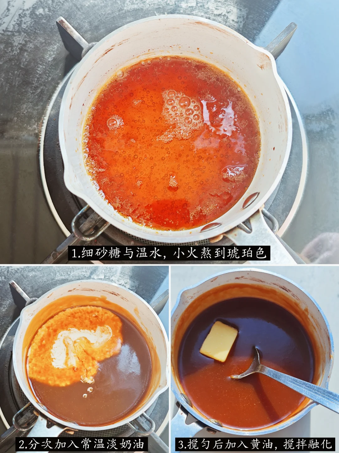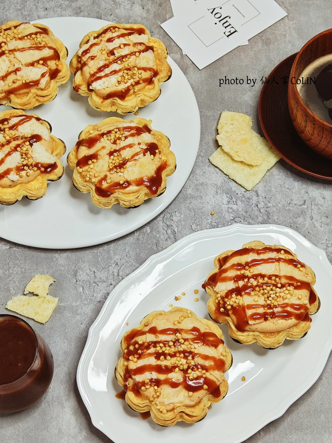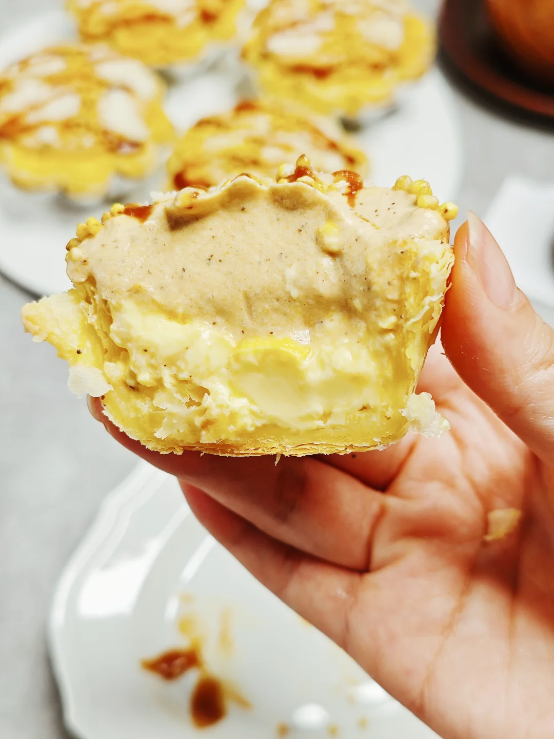好想知道是哪个天才发明的这个组合[萌萌哒R]Q弹香甜的布丁,堆满了咸奶茶焦糖奶油,顶部撒上内蒙炒米和奶皮子。外面被酥皮包裹❗❗好吃的一塌糊涂❗❗ · 👩🏻‍🍳【所需材料】: 🌈焦糖酱: 细砂糖100g|清水20g|淡奶油100g|黄油15克|海盐1g 🍯【做法】: ❶锅中先加入细砂糖和清水,小火熬到琥珀色, ❷分次加入温热的淡奶油,再放黄油和海盐搅拌均匀,冰箱冷藏备用 - 👩🏻‍🍳【所需食材】: 🌈焦糖咸奶茶奶油: 淡奶油200g|伯爵红茶3g|海盐2g|细砂糖10g|焦糖酱30g 🍯【做法】: ❸锅中倒入淡奶油、伯爵红茶、海盐,小火加热煮出茶香,焖10分钟后滤出红茶;贴保鲜膜冰箱冷藏一夜后, ❹加入焦糖酱,打发硬挺。 - 👩🏻‍🍳【所需食材】: 🌈布丁挞: 蛋黄2个|细砂糖15g|牛奶120g|淡奶油100g|香草精2滴|蛋挞皮6个 🍯【做法】: ❺蛋黄与细砂糖搅拌均匀,倒入牛奶、淡奶油、香草精,搅拌均匀后过筛2遍 ❻倒入解冻好的挞皮里,入烤箱200度25分钟 - 🍯组装: ❼把焦糖咸奶茶奶油,挤在蛋挞上,铺满奶皮子、炒米,再淋上焦糖酱。