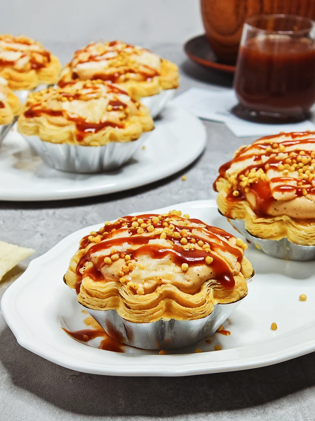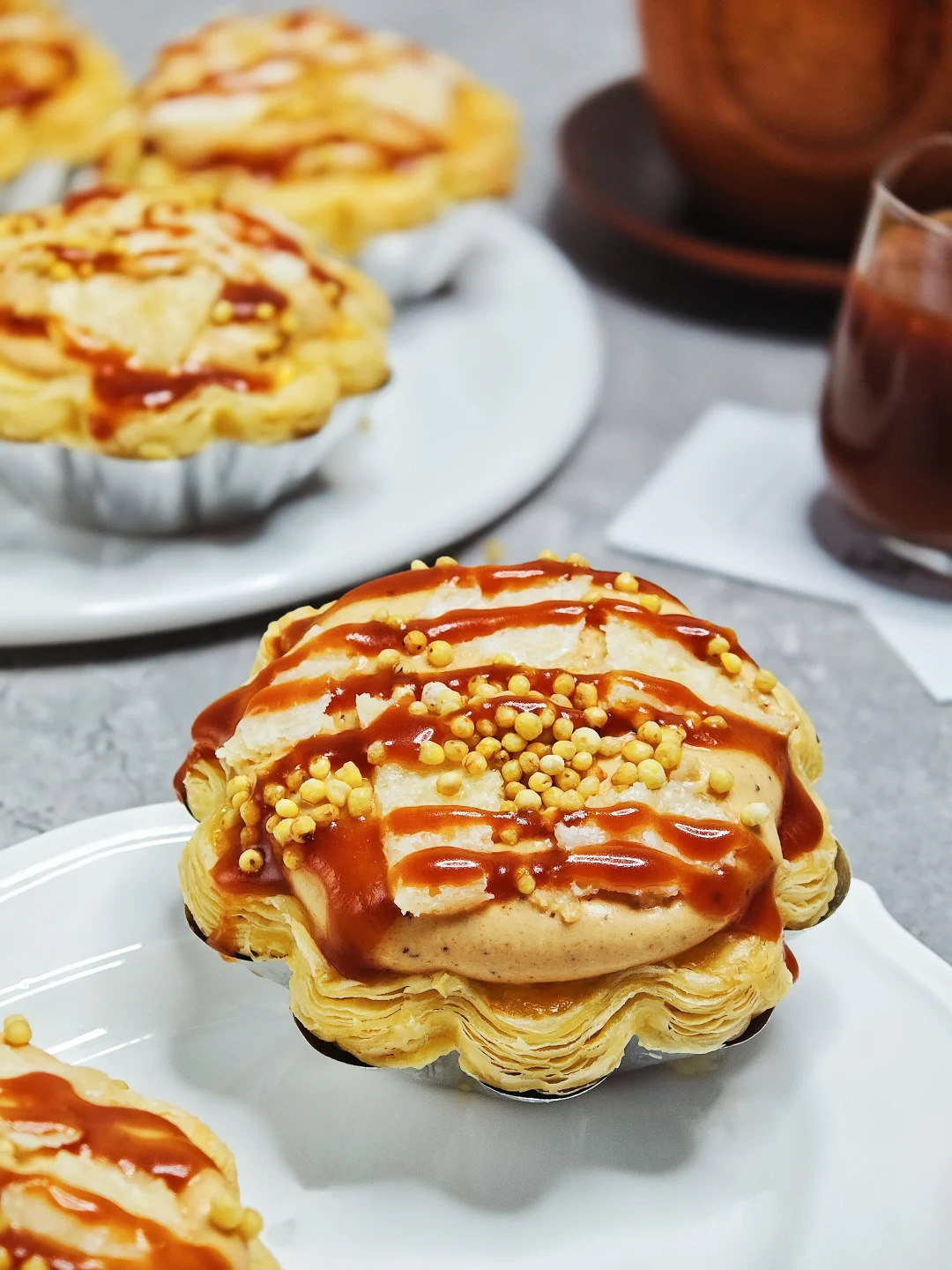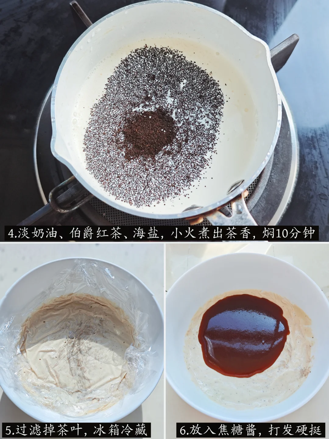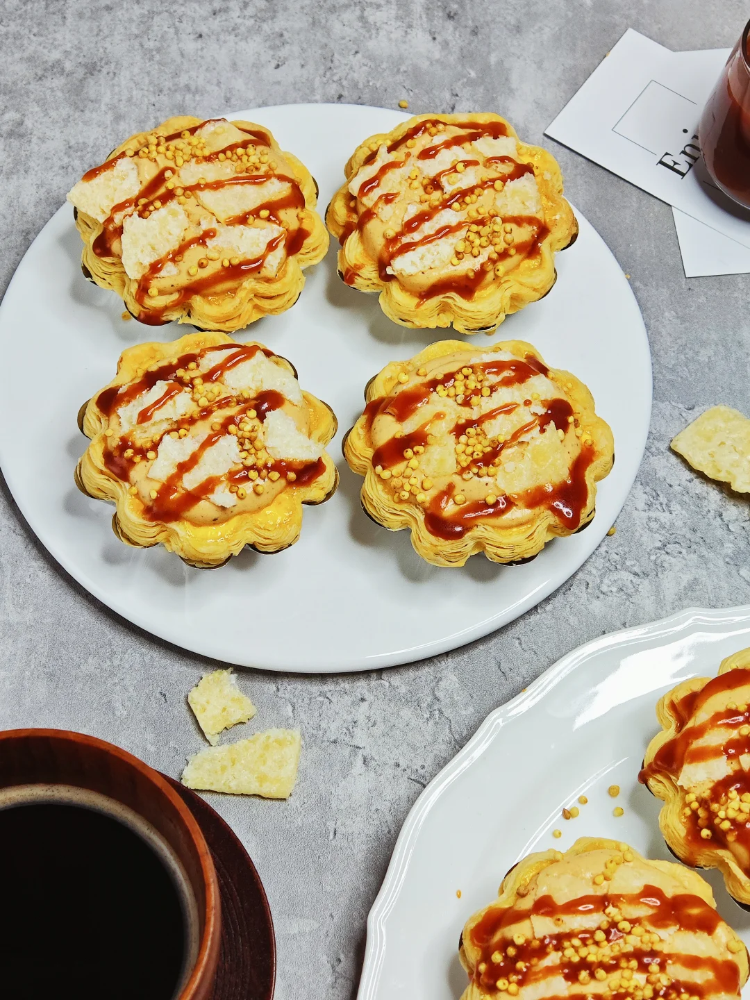 好想知道是哪个天才发明的这个组合[萌萌哒R]Q弹香甜的布丁,堆满了咸奶茶焦糖奶油,顶部撒上内蒙炒米和奶皮子。外面被酥皮包裹❗❗好吃的一塌糊涂❗❗ · 👩🏻‍🍳【所需材料】: 🌈焦糖酱: 细砂糖100g|清水20g|淡奶油100g|黄油15克|海盐1g 🍯【做法】: ❶锅中先加入细砂糖和清水,小火熬到琥珀色, ❷分次加入温热的淡奶油,再放黄油和海盐搅拌均匀,冰箱冷藏备用 - 👩🏻‍🍳【所需食材】: 🌈焦糖咸奶茶奶油: 淡奶油200g|伯爵红茶3g|海盐2g|细砂糖10g|焦糖酱30g 🍯【做法】: ❸锅中倒入淡奶油、伯爵红茶、海盐,小火加热煮出茶香,焖10分钟后滤出红茶;贴保鲜膜冰箱冷藏一夜后, ❹加入焦糖酱,打发硬挺。 - 👩🏻‍🍳【所需食材】: 🌈布丁挞: 蛋黄2个|细砂糖15g|牛奶120g|淡奶油100g|香草精2滴|蛋挞皮6个 🍯【做法】: ❺蛋黄与细砂糖搅拌均匀,倒入牛奶、淡奶油、香草精,搅拌均匀后过筛2遍 ❻倒入解冻好的挞皮里,入烤箱200度25分钟 - 🍯组装: ❼把焦糖咸奶茶奶油,挤在蛋挞上,铺满奶皮子、炒米,再淋上焦糖酱。